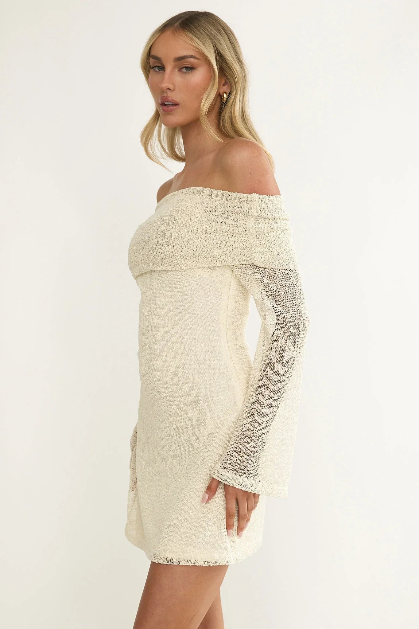 Steal the spotlight in our gorgeous Alivya mini dress. Featuring sheer sleeves and an off-shoulder design. It's perfect for a special birthday celebration teamed with strappy, nude heels and a tote for a super chic look.