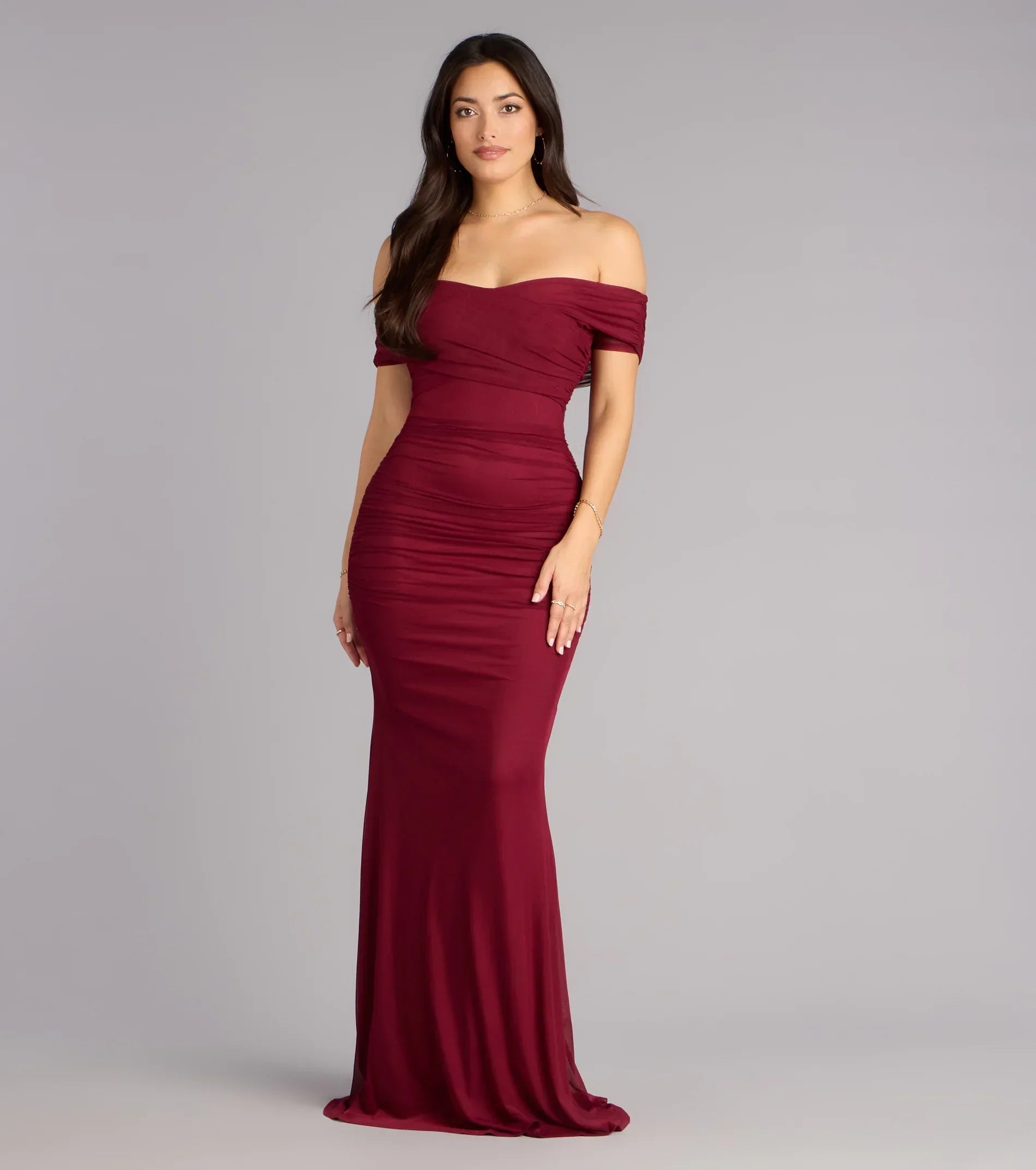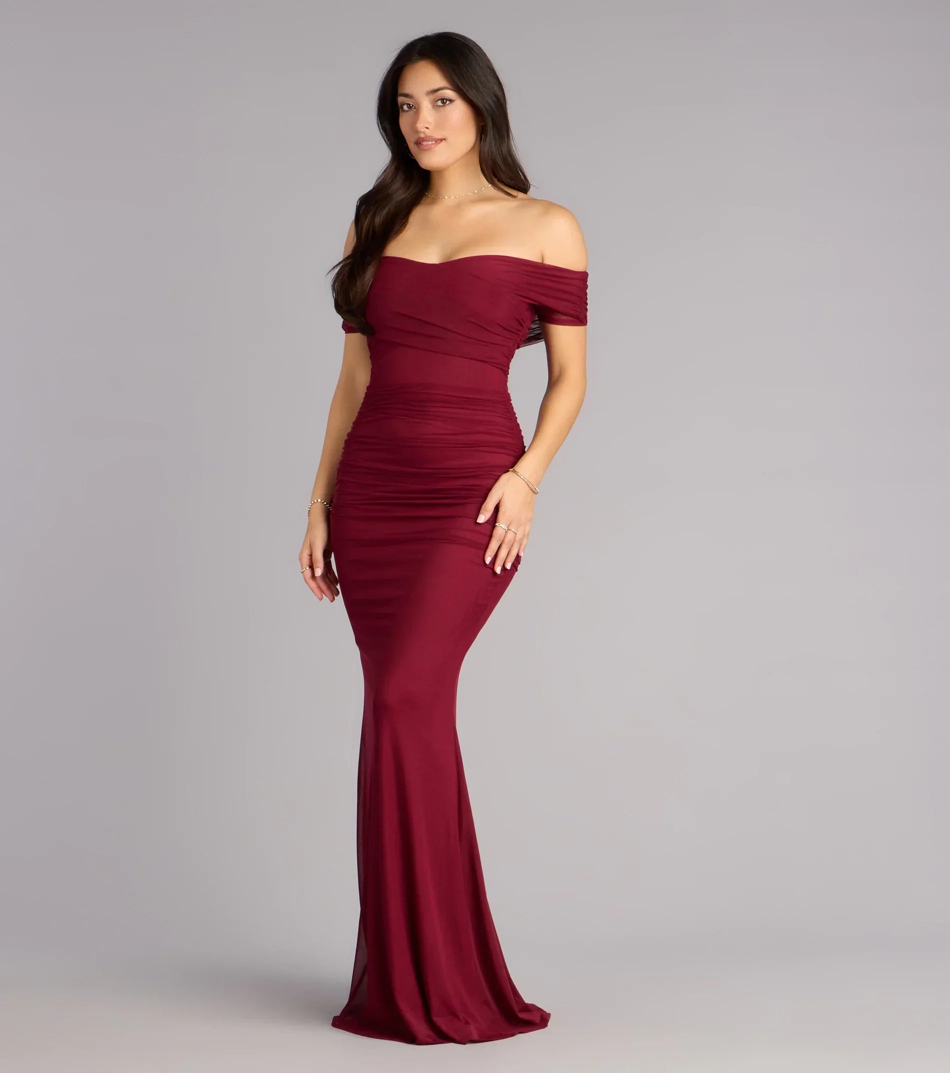 Made for the spotlight and sculpted to stun, the Allison gown is your red carpet moment. Crafted from curve-hugging mesh with allover ruching and an elegant off-shoulder neckline, this mermaid dress brings just the right amount of drama.