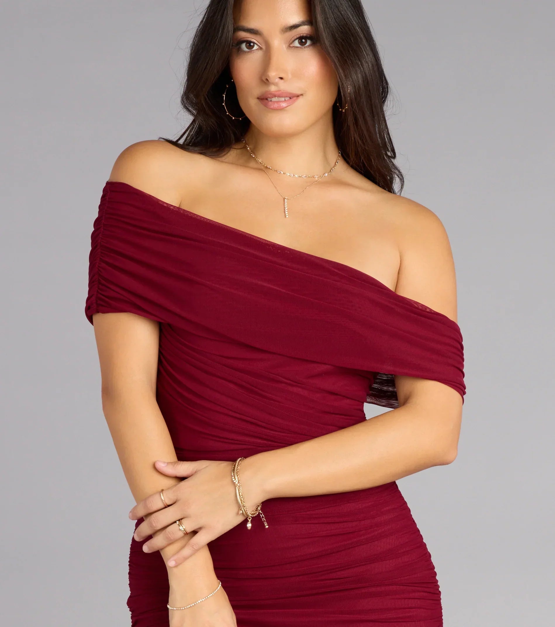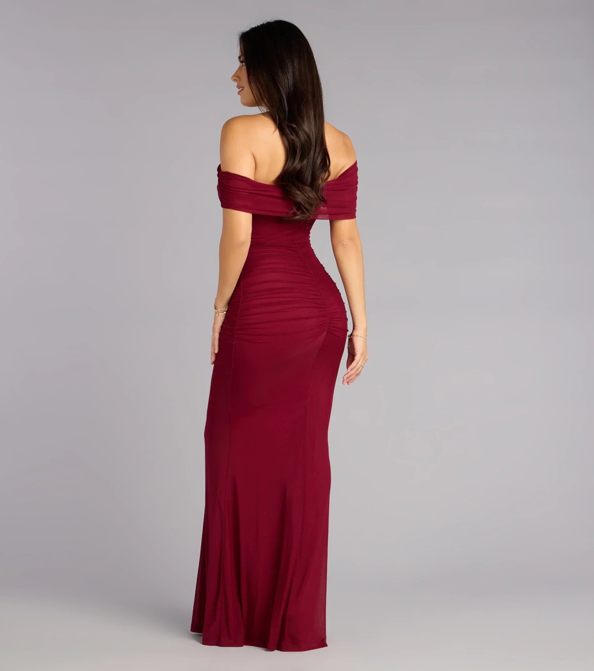 Stand out with confidence and grace in the Ashlynn mesh formal dress! Featuring a striking off-shoulder neckline and elegant side ruched seams, this floor-length gown sculpts your silhouette with a flattering mermaid fit.