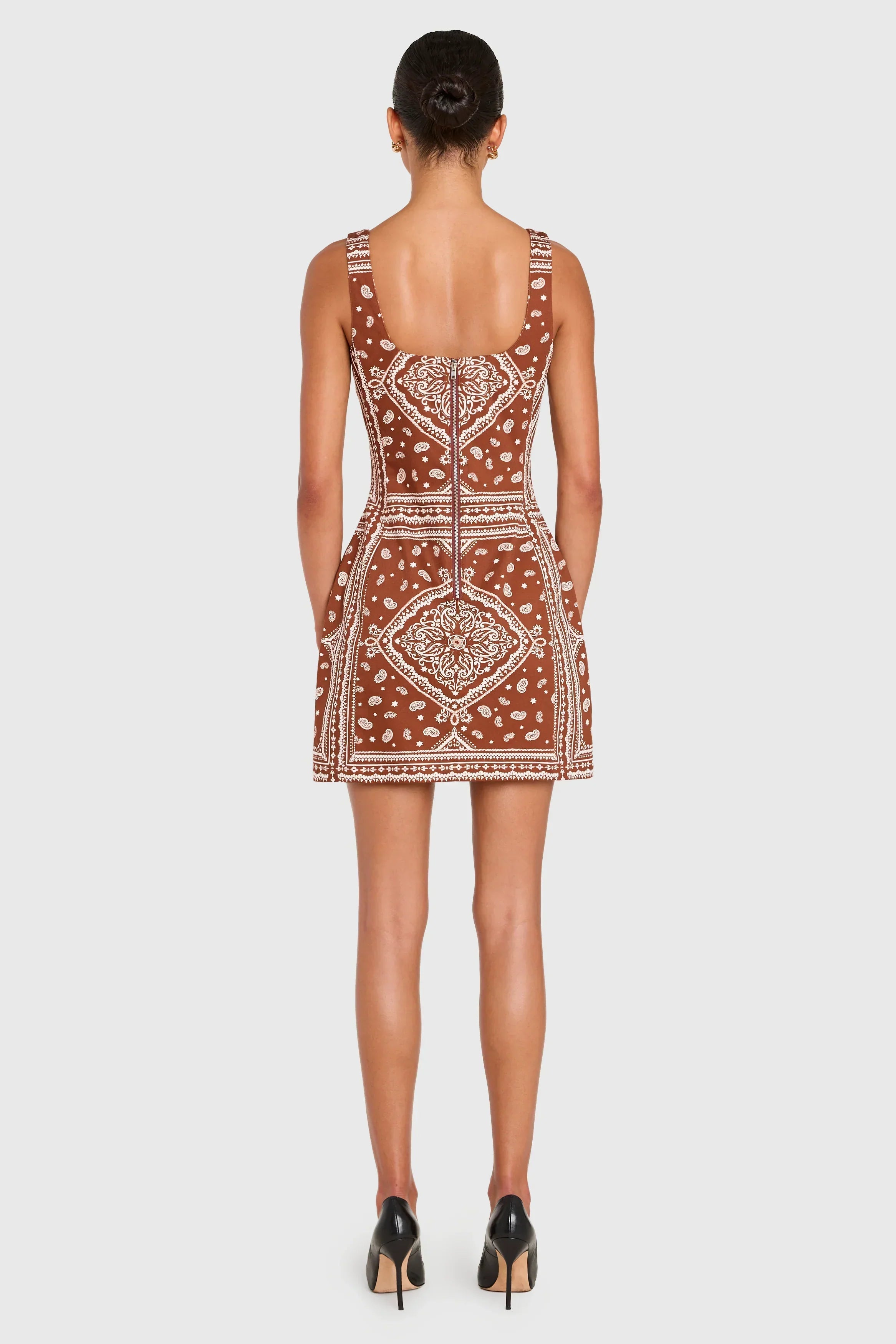 Play it cool in the Augustine Dress. With a square neckline, mini cut, and bold bandana print, this western-inspired piece brings a cool sense of edge to your summer wardrobe. Pair with an oversized denim jacket and cowboy boots to complete the look.