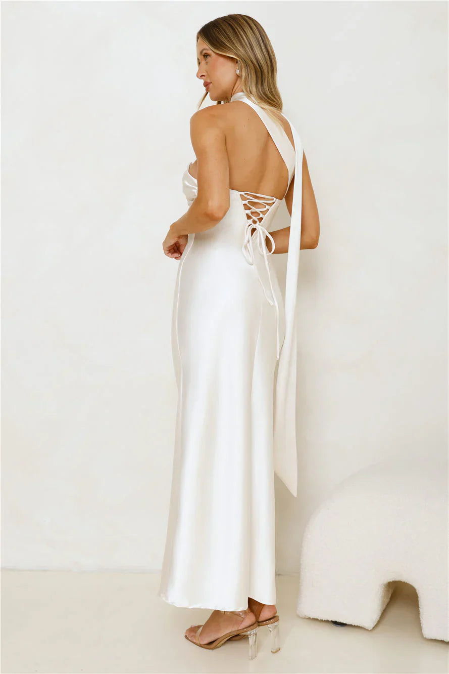 The Be Noticed Strapless Satin Maxi Dress features an elegant neck wrap, a gathered top with boning for structure and a crisscross back. Perfect for formal events — style with heels and statement earrings for a show-stopping look.