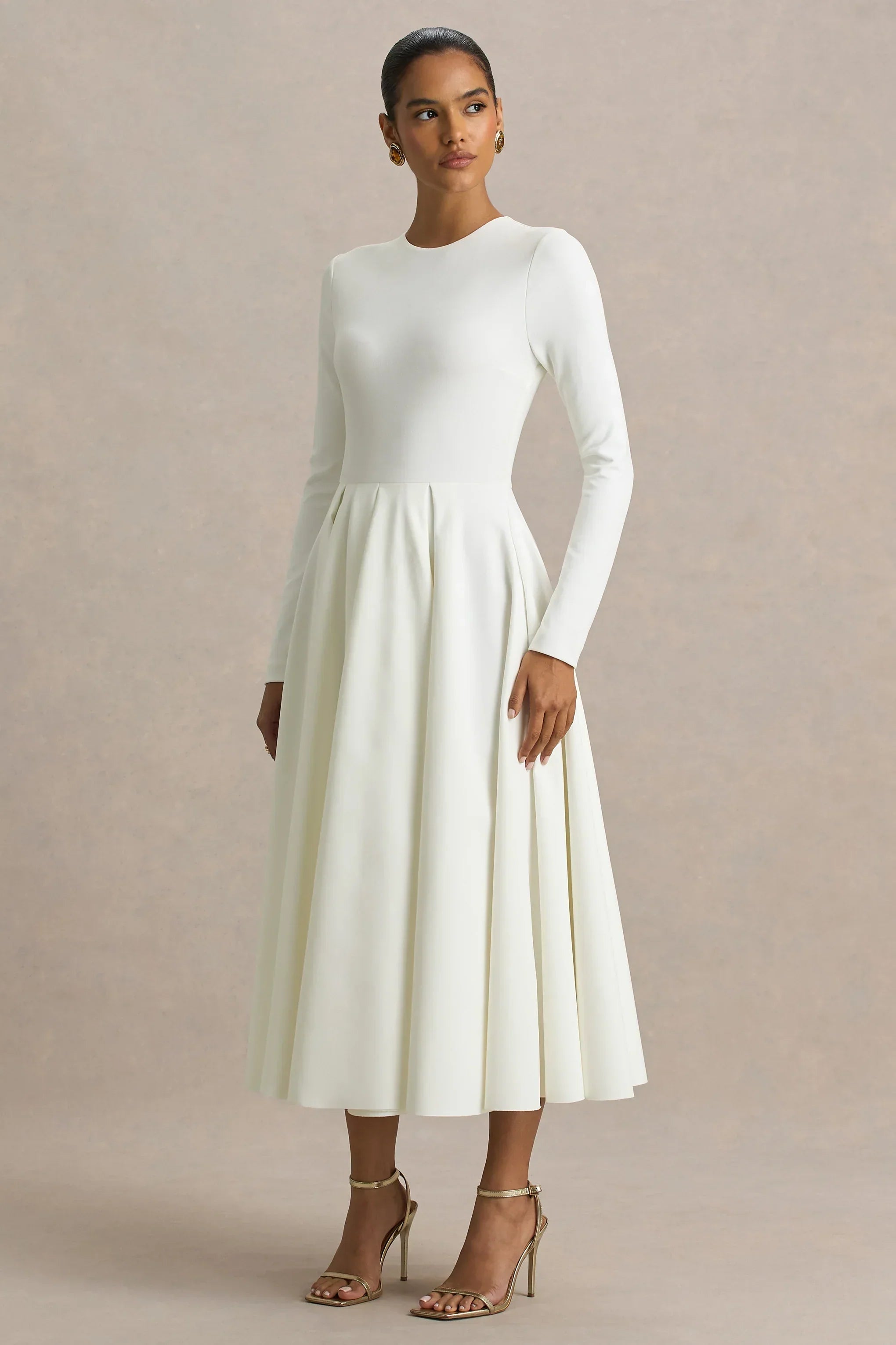 Sleek, structured, and endlessly sophisticated, meet Bellamy. Crafted from our premium scuba crepe in a rich cream hue, this midi silhouette is all about timeless elegance with a modern twist. Designed with a clean crew neckline and long, sleeves, Bellamy creates a streamlined shape that enhances your curves while keeping the look elegantly refined. Style with striking earrings and a sleek up do, for a look that'll capture the rooms attention.