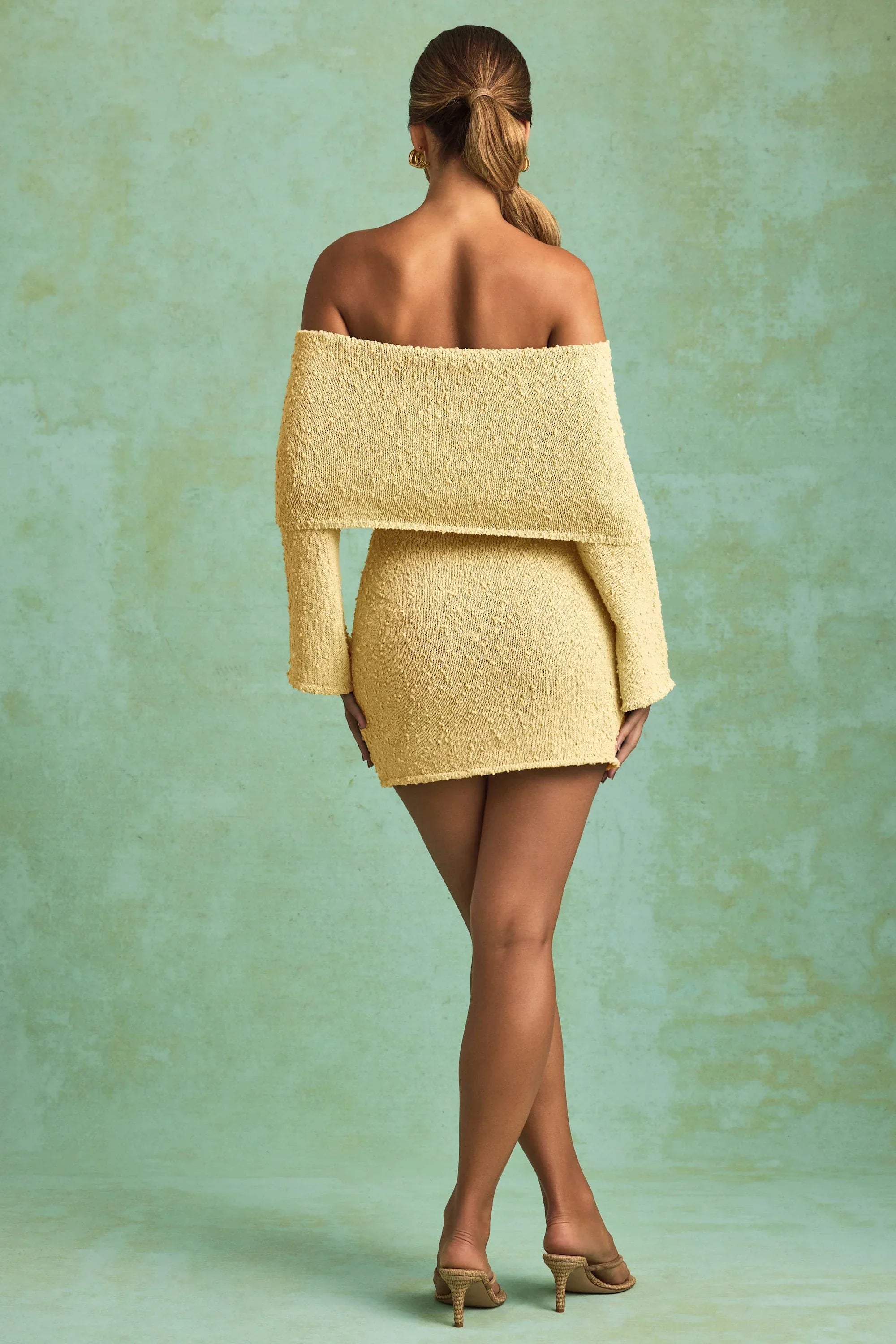 The forecast: hot. Made for warm-weather styling from day to night, the Souline mini dress is crafted from lightly textured and subtly sheer bouclé knit fabric made with cotton and a touch of stretch for a figure-skimming fit. It’s cut to an off-shoulder silhouette with an exaggerated foldover panel and flared long sleeves.