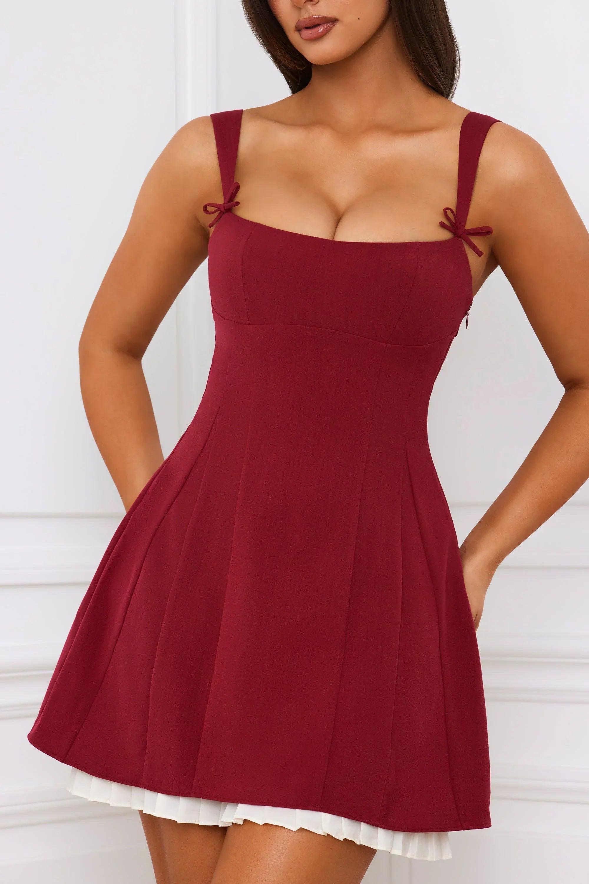 Whimsical silhouettes. Crafted from a woven stretch fabric that contours to your curves, the Cressida mini dress is a sweet design that’s underlaid with a contrasting pleated georgette skirt. It’s cut to an A-line silhouette with shaping princess seams, a Bardot scoop neckline, and adjustable shoulder straps with functional rouleau ties.