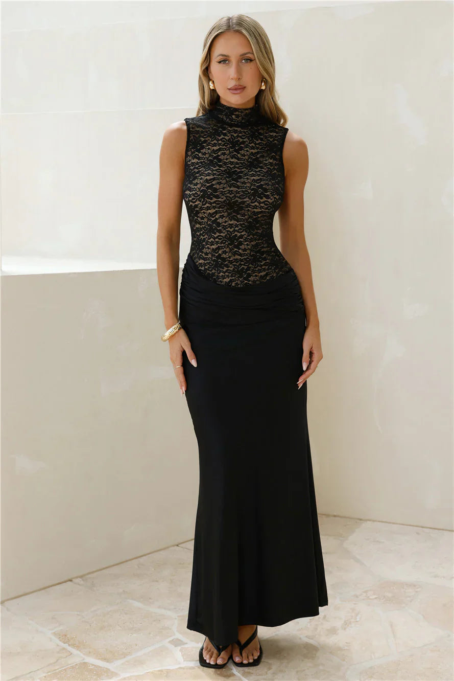 Get ready to steal the spotlight in the Casana Maxi Dress. With its elegant mock neck and delicate lace bodice layered over a soft nude lining, this maxi dress is the perfect mix of sweet and sophisticated. The invisible side zipper keeps the look seamless, while the lined stretch fabric offers comfort that moves with you. Maxi length perfection for any occasion!