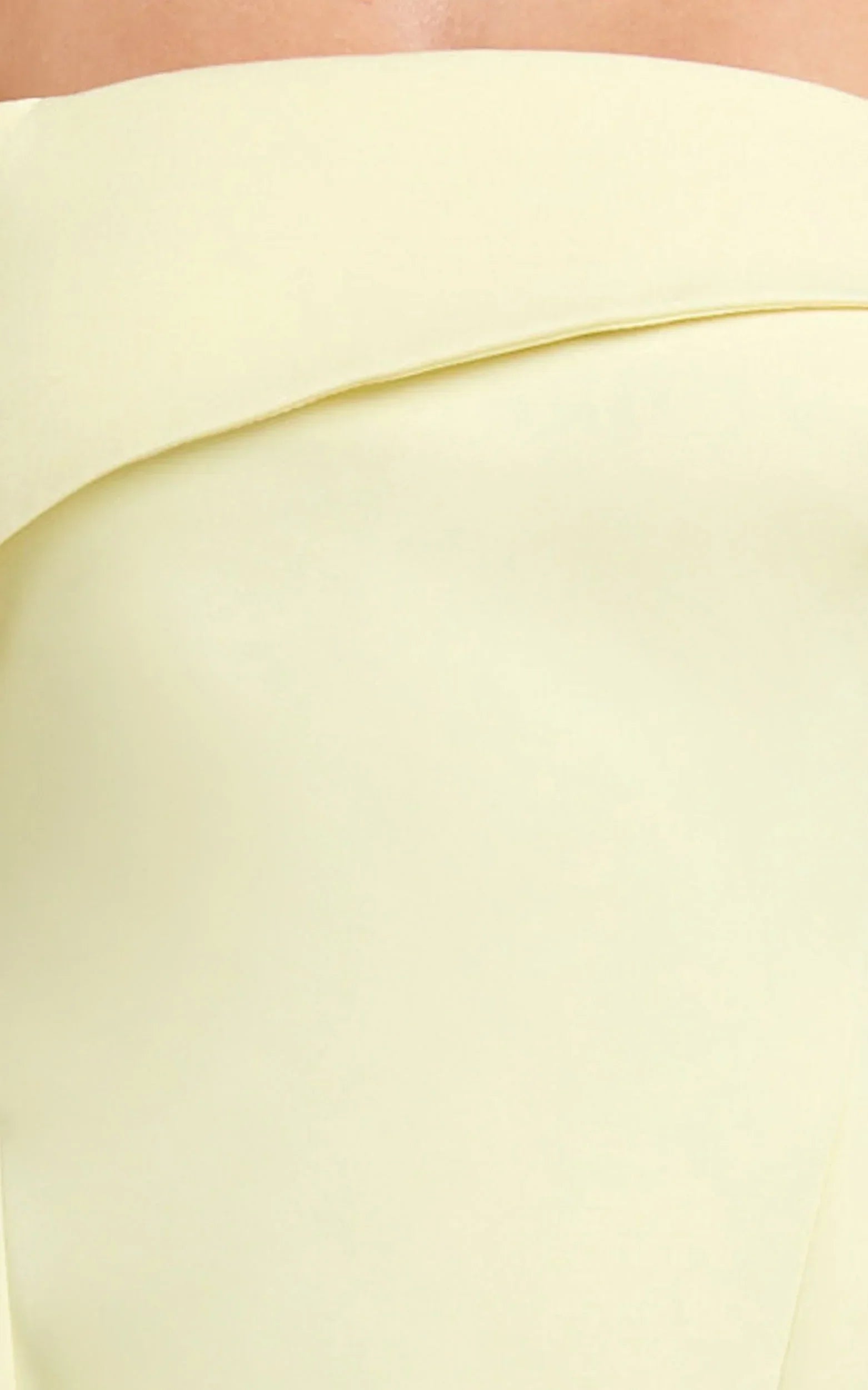 This lovely off-the-shoulder dress in a fresh lemon shade features playful tie details, highlighting your natural glow and giving you an effortlessly chic vibe. With eye-catching asymmetrical sleeves and a flattering, hourglass silhouette, this mini dress adds a touch of modern femininity to any look.