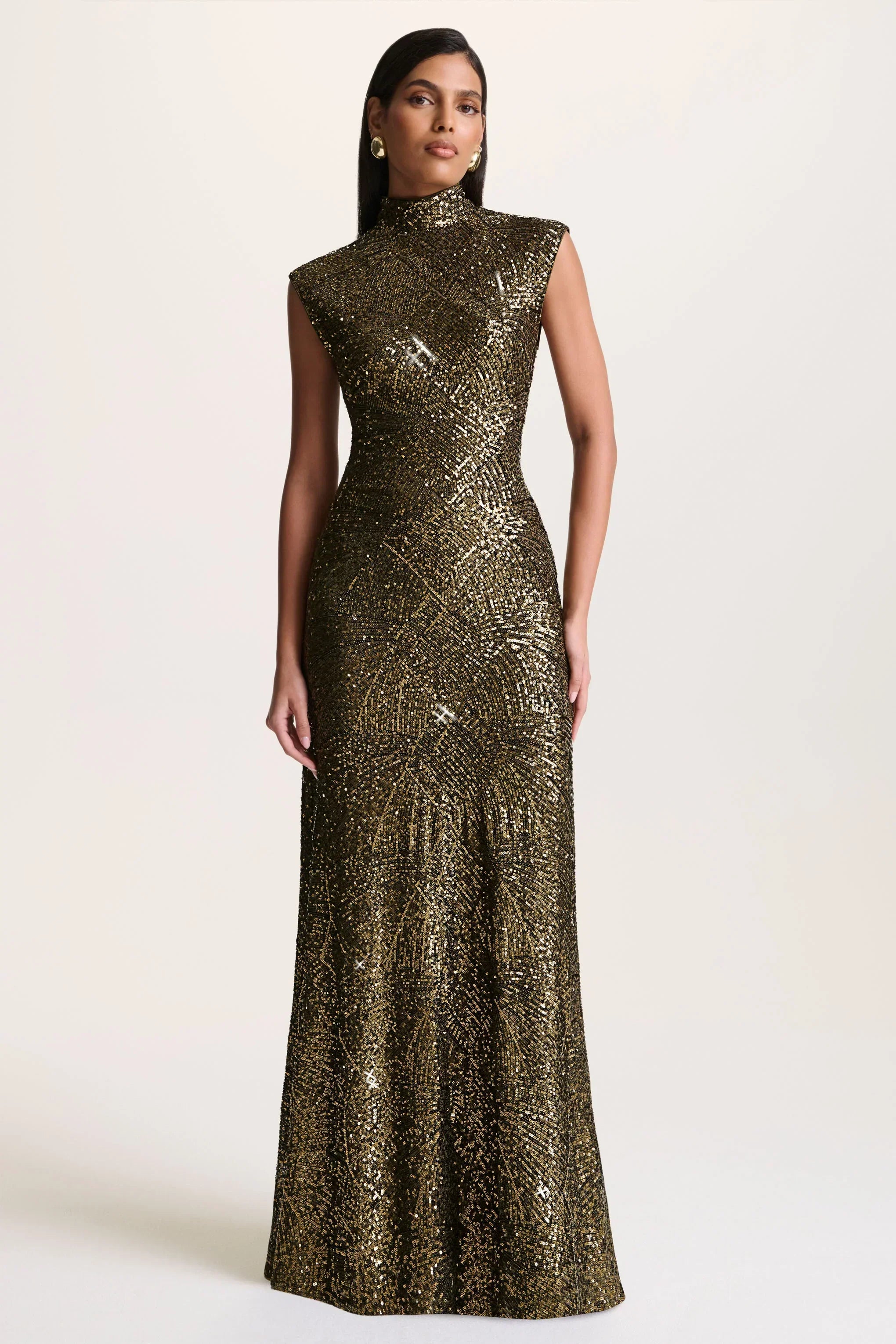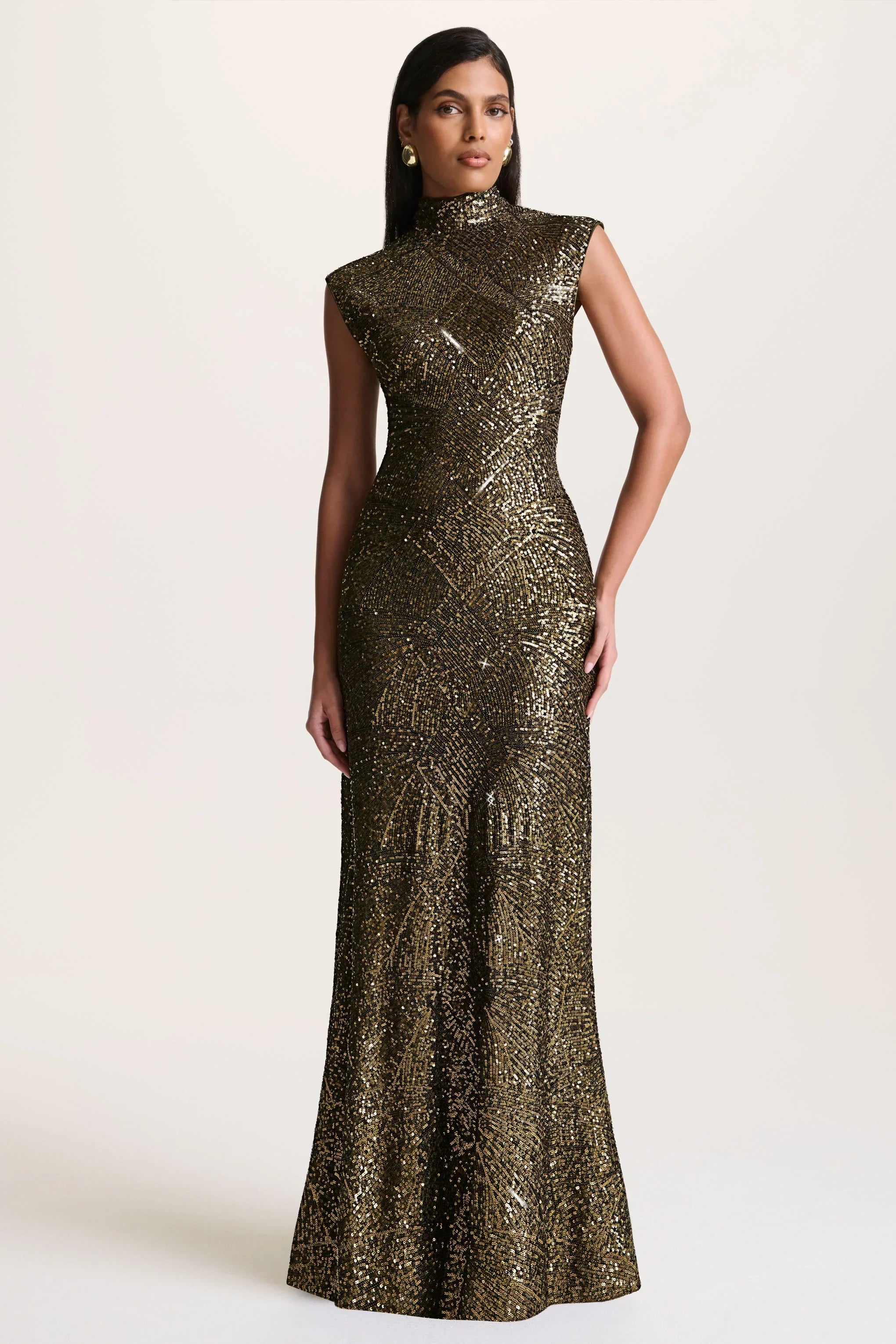 Make a dazzling entrance in Cecy, a timeless design that embodies effortless sophistication. Crafted from our premium khaki sequin, this stunning maxi dress shimmers beautifully with every step. The elegant high neckline and chic cap sleeves create a refined silhouette, perfect for the most glamorous of occasions. Sleek, striking, and endlessly captivating- Cecy is made for memorable moments.