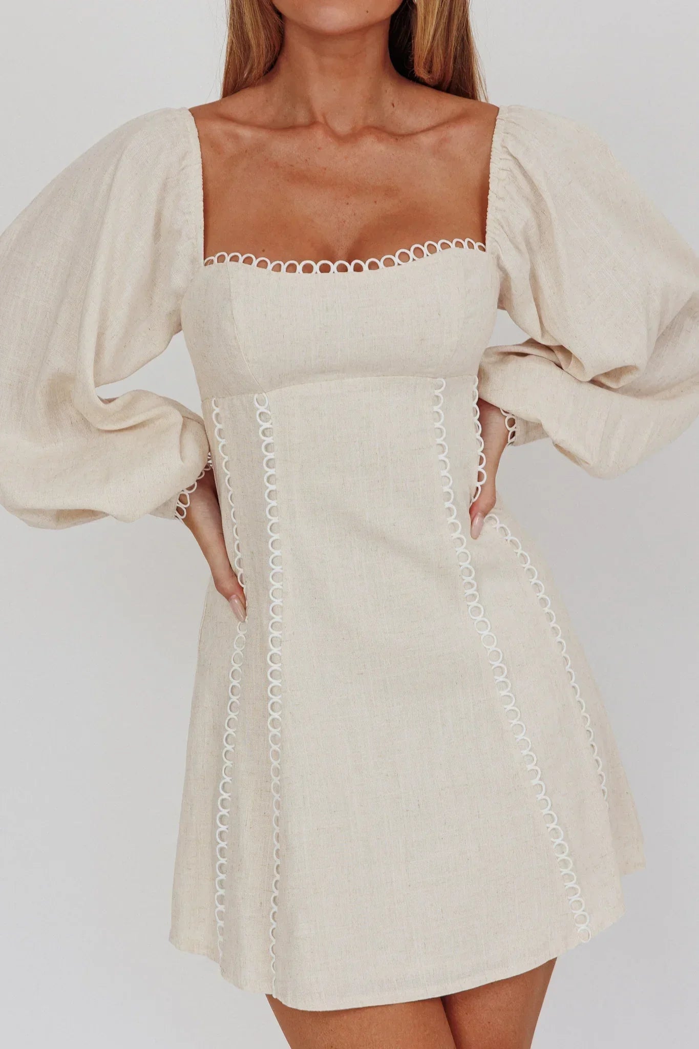 Breeze through the weekend in our chic Chamberlain mini dress. We are obsessed with balloon sleeves and romantic square neckline. Perfect for champagne brunch with your girls teamed with kitten heels and a saddle bag.
