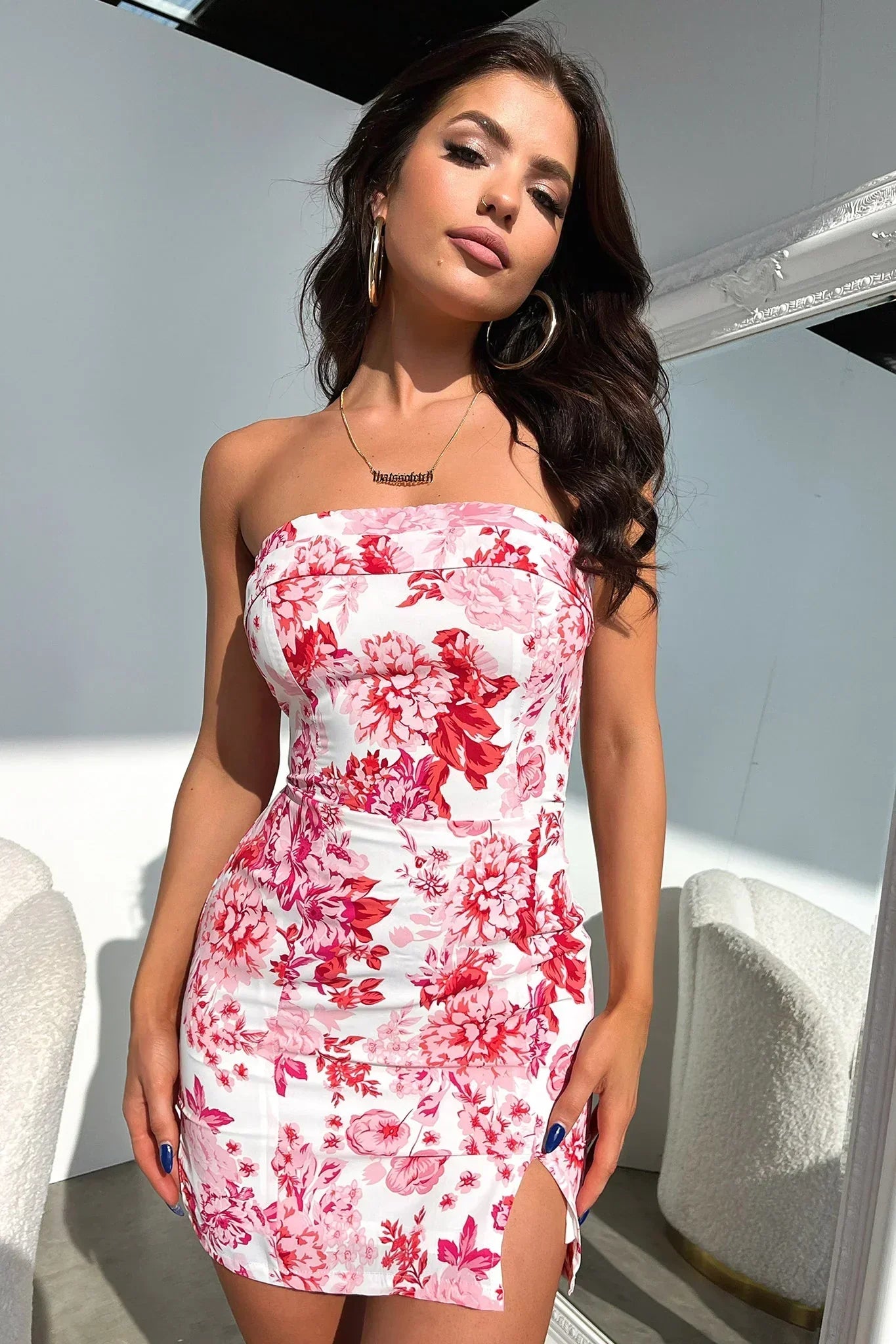 Next level update in the Charms Mini Dress! She offers a structured bodycon fit, a strapless cut, a little side slit, double lined material with. stunning floral print and an invisible back zipper. Style her with black heels, a little bag and some hoops for a chic stylish look.