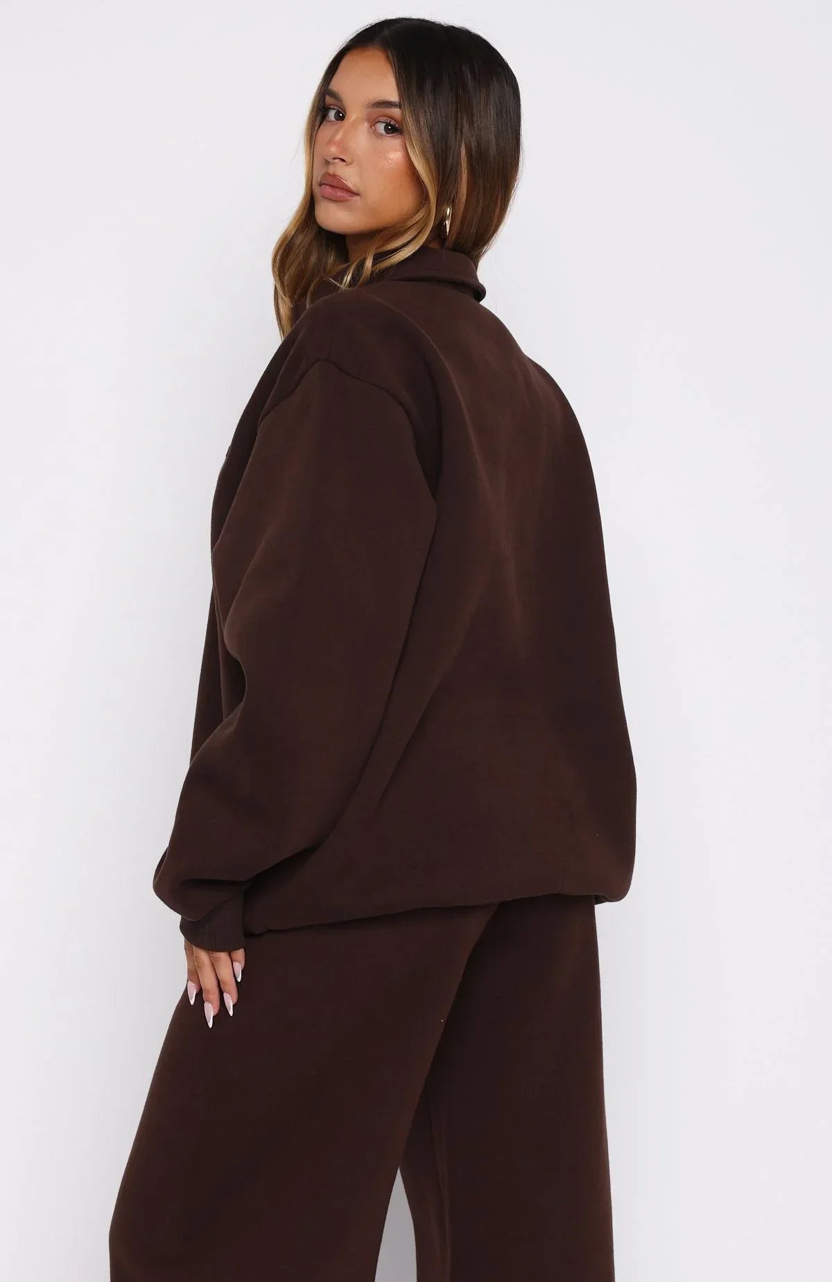 Slip into pure chill in our Chill Moves Oversized Henley Sweater in Chocolate! Features a soft fleece interior, oversized silhouette with a collared V‑neckline, button placket, drop shoulders, long sleeves, ribbed cuffs and hem, and a subtle White Fox emboss accent. Style with the matching Chill Moves Wide Leg Sweatpants Chocolate for a cosy fit.
