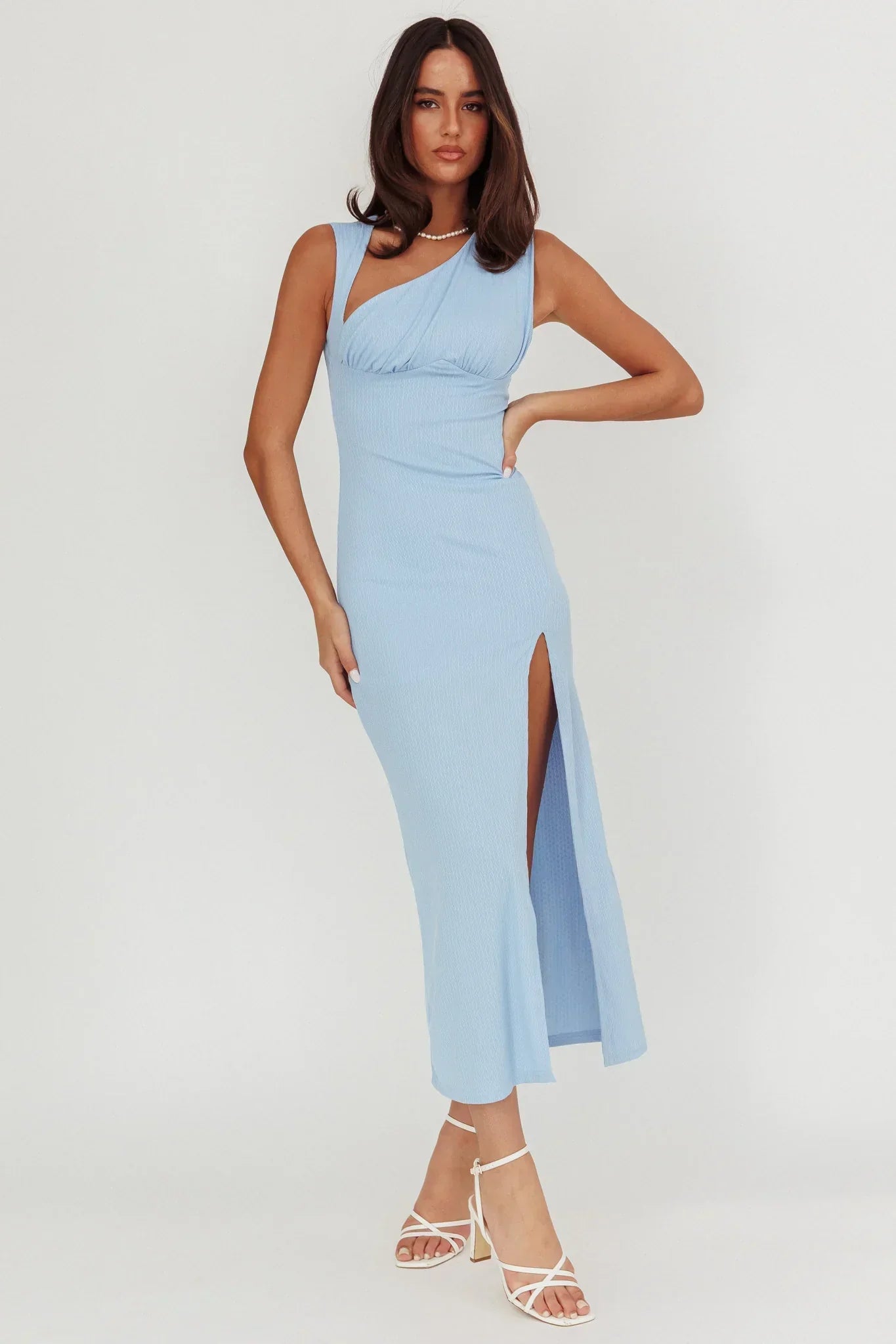 Turn heads in our gorgeous Daleela maxi dress. It features an asymmetric neckline and a thigh-high split in the front. It's perfect for bridal events or a romantic anniversary dinner. Team it with strappy, nude tie-up heels and a clutch for an unforgettable look.