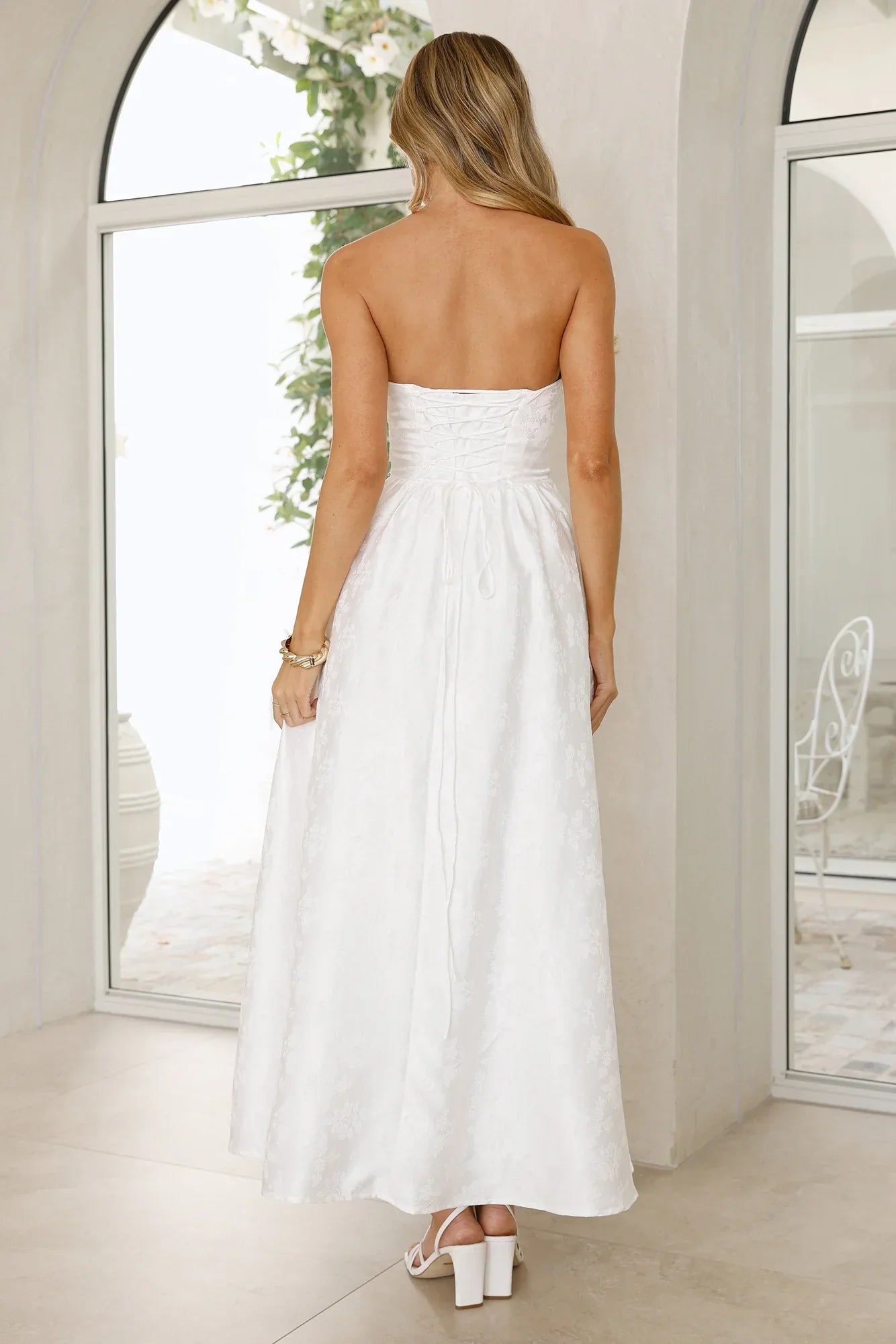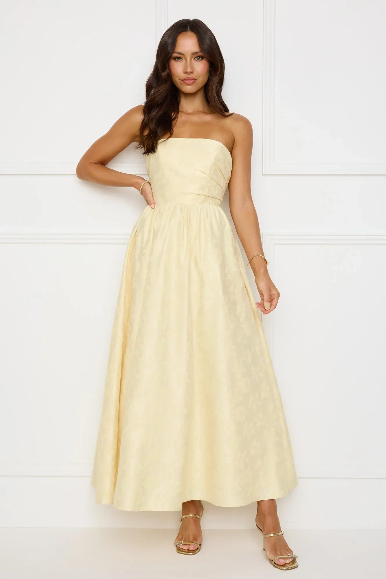 Be admired for your style in the Dancing In Magic Strapless Maxi Dress. Featuring a strapless design, a crisscross back and boning to the bodice. Style with heels to highlight the voluminous skirt.