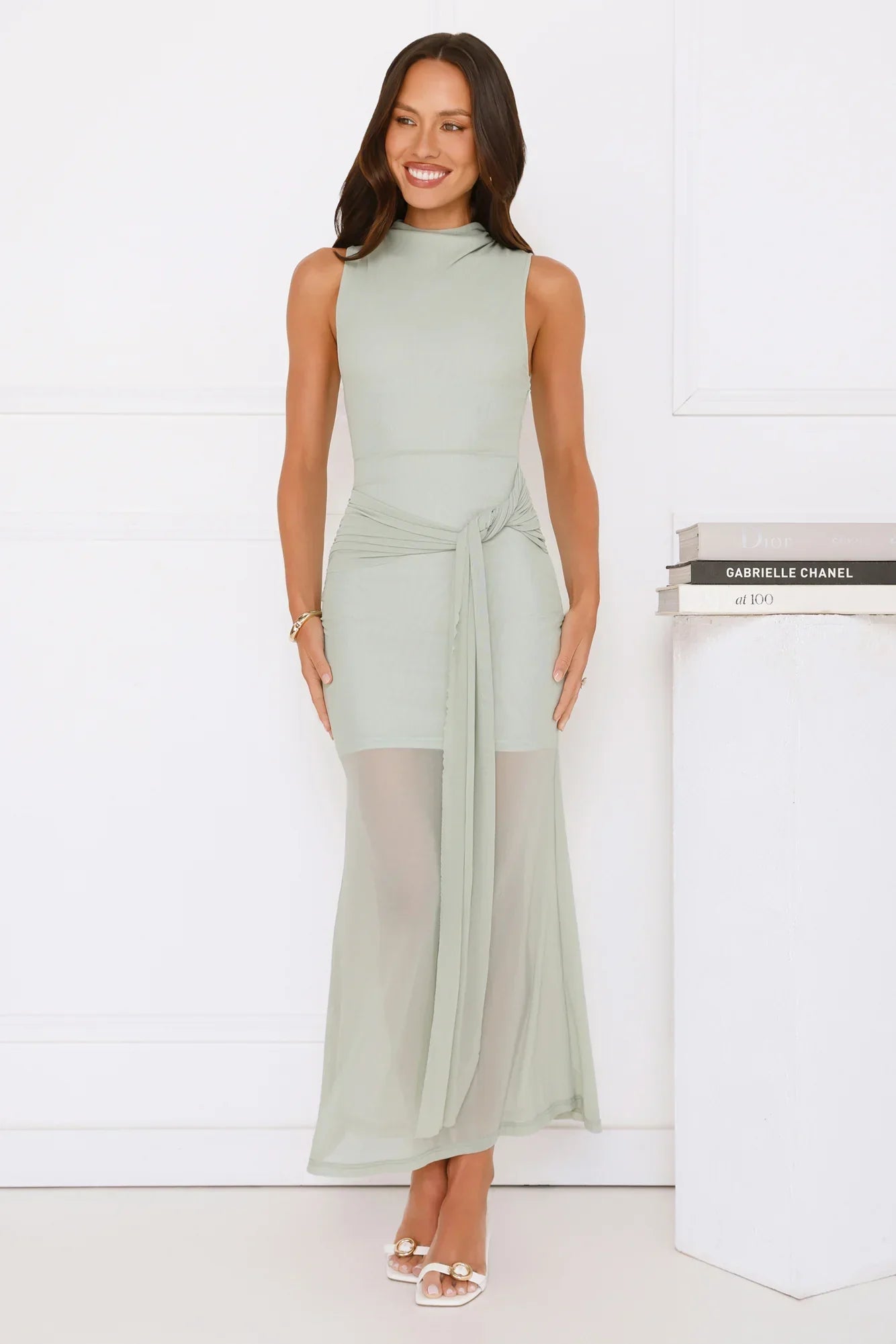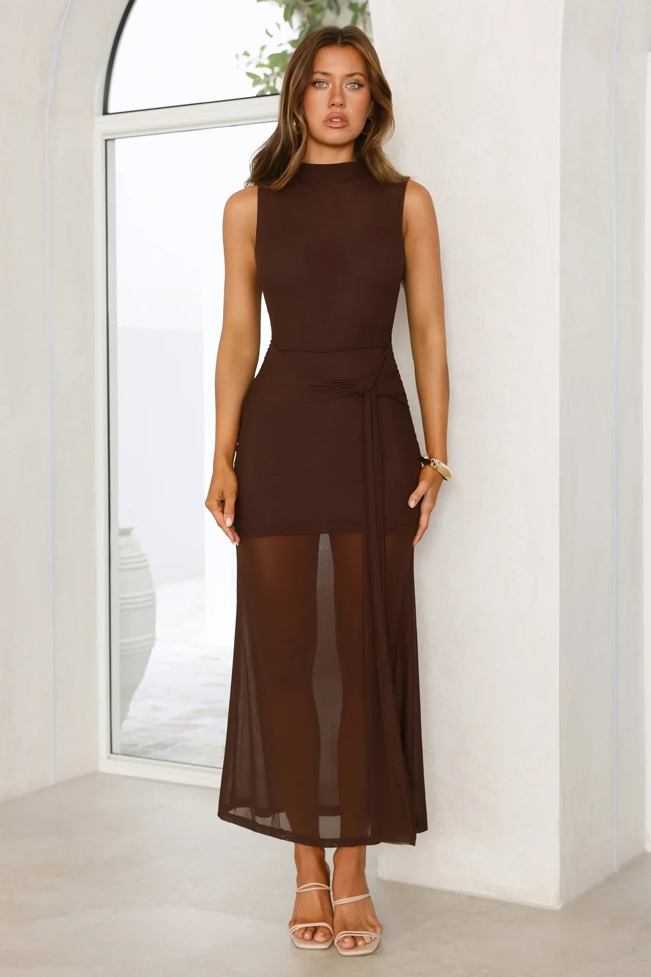 The Dazzle Me Darling Mesh Maxi Dress features a flowing mesh design with a waist tie and sheer hem, giving it a soft, romantic feel. Pair with heels for a chic, effortless look.