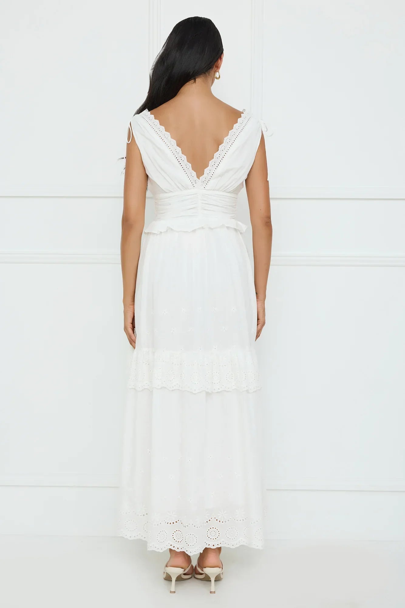 Be admired for your style in the Desert Oasis Maxi Dress. Featuring a V-neck, drawstring ties to the shoulders and a flowy skirt with dainty embroidery. Style with sandals and beachy waves.