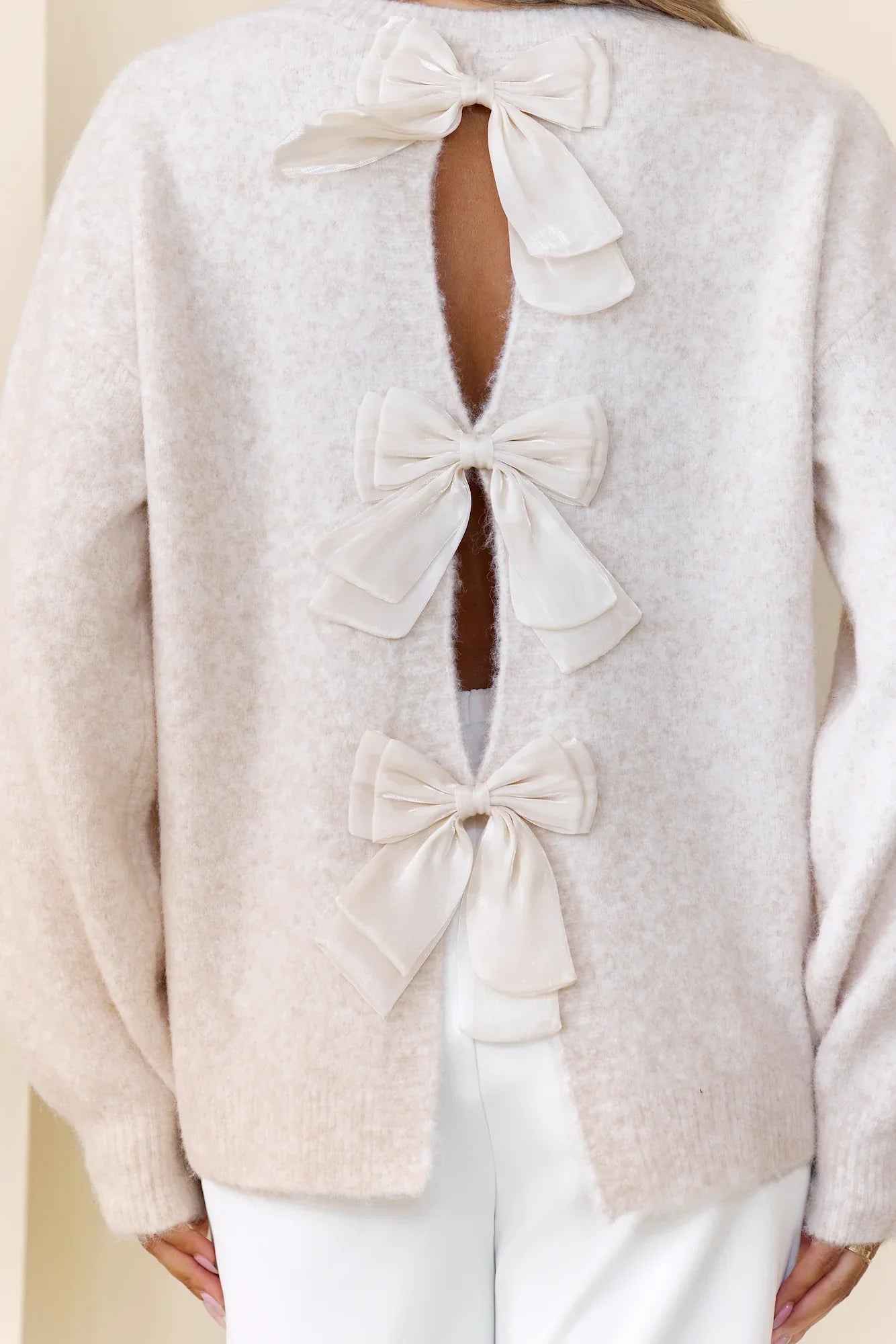 Stay cosy with a stylish twist in the Detailed Back Knit Sweater. Featuring a knitted design, stretch fit, back cutout, and bow details, this slip-on sweater is perfect for brunches, simple outings, or layering. Pair with high-waisted jeans or skirts and ankle boots for an effortlessly chic look.