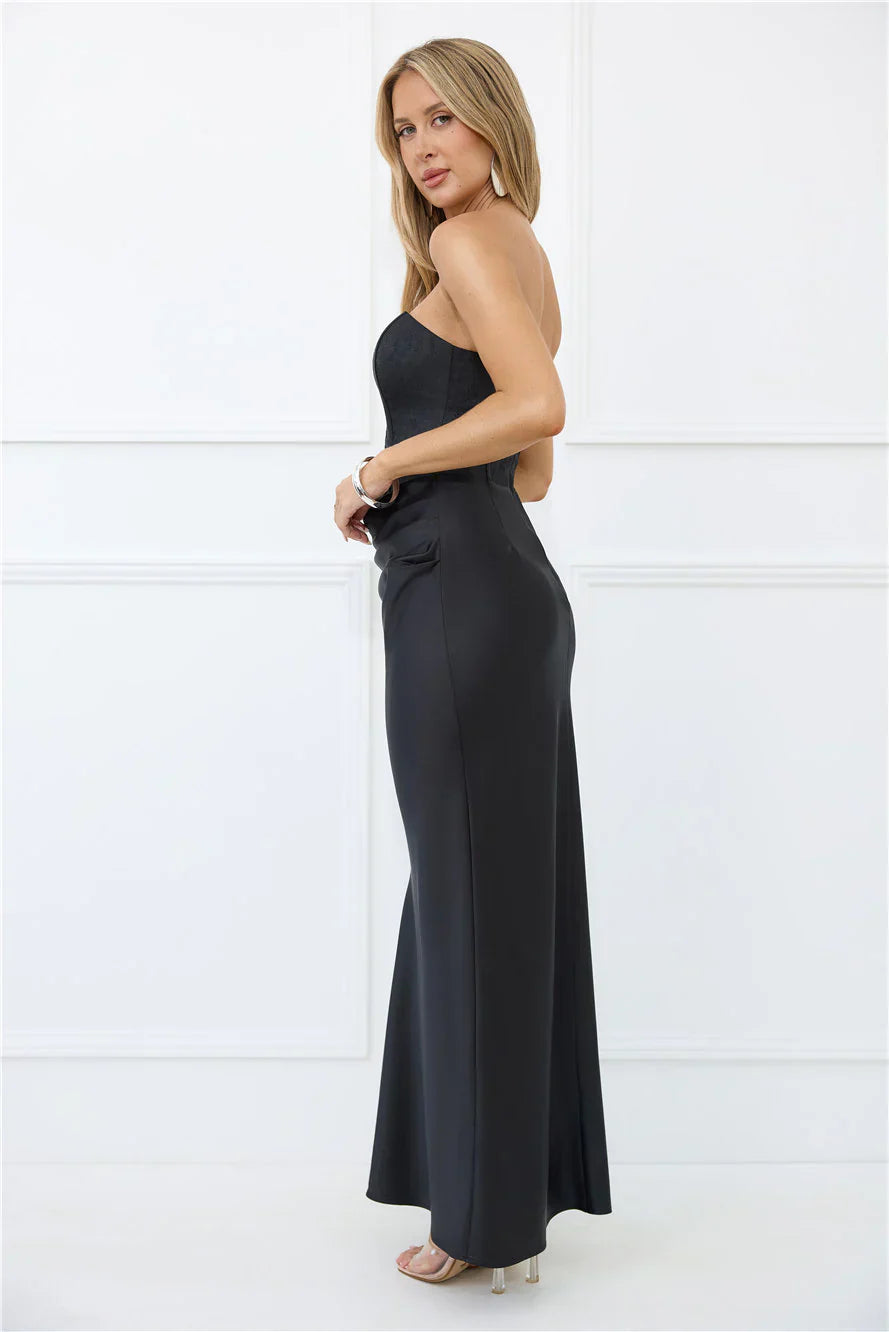 The Dressed To Dazzle Strapless Satin Maxi Dress features a structured bodice with boning, a gathered detail to the satin skirt and a gorgeous strapless neckline. Style with heels and sparkly accessories.