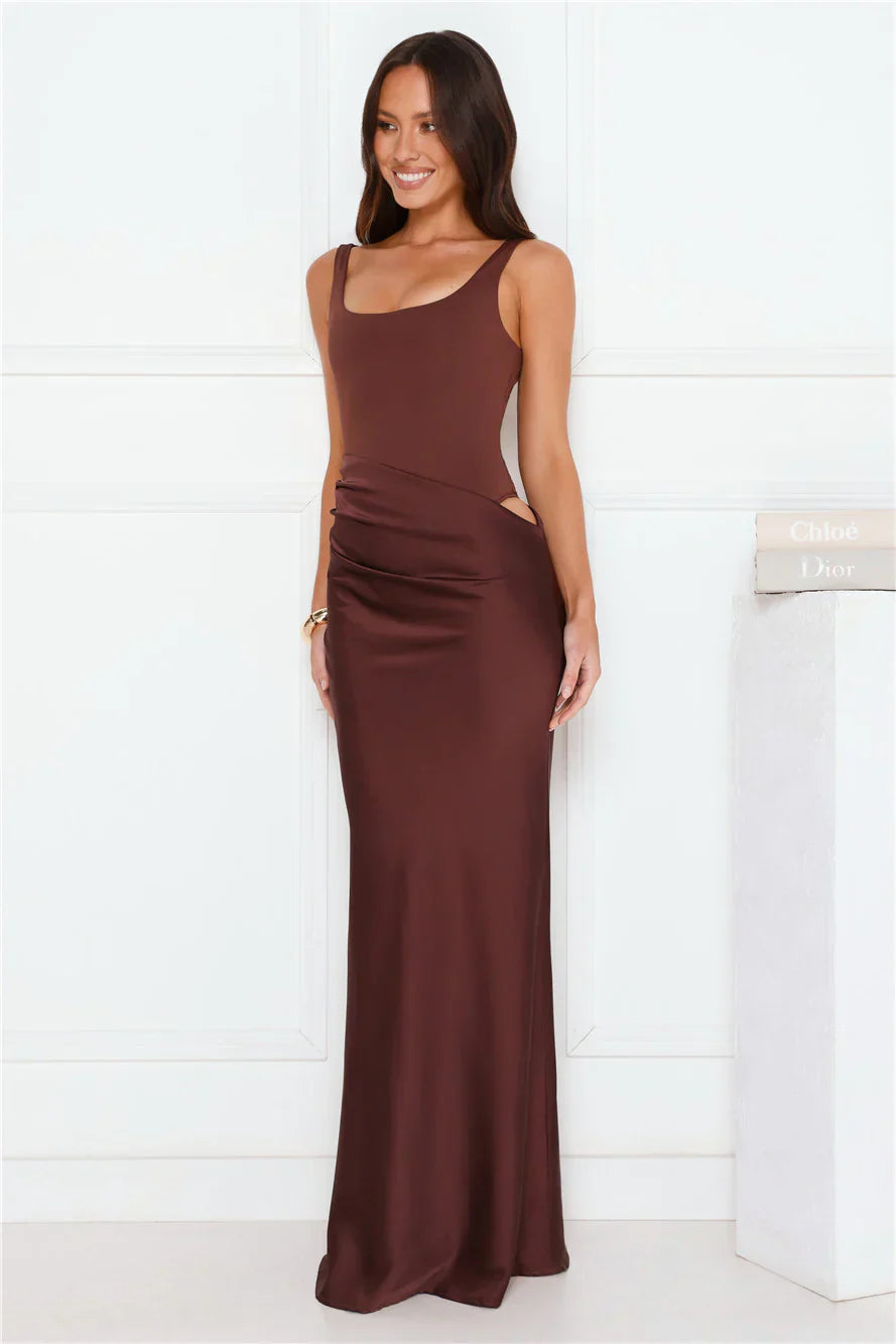 The Effortlessly Yours Satin Maxi Dress features a stretch bodysuit-style top with convenient snap closures, a flowing satin skirt and a slit to the waist. Style with heels.