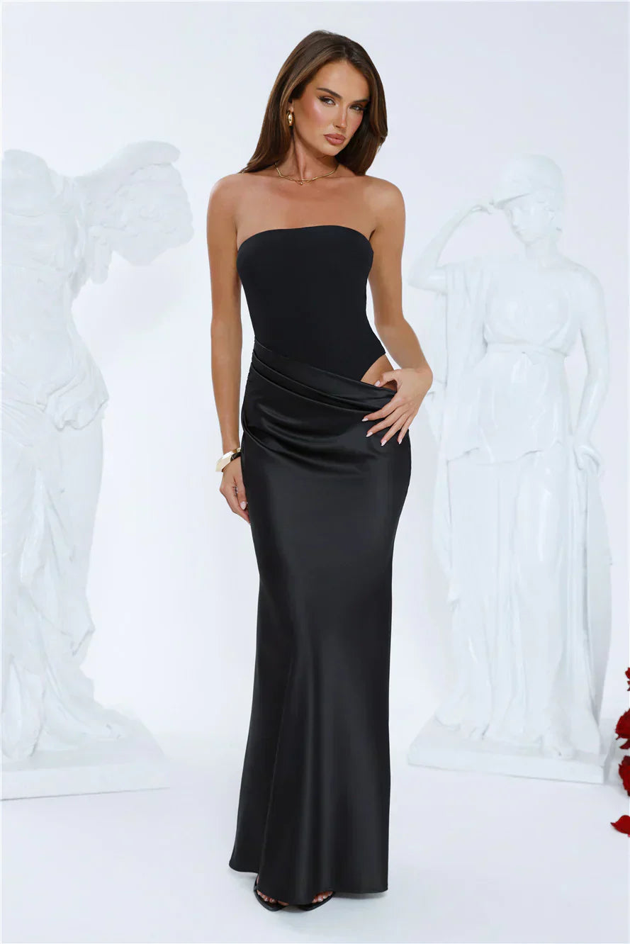 The Elevated Simplicity Strapless Satin Maxi Dress brings sleek design and modern detailing together in one statement silhouette. Featuring a stretch mesh bodysuit-style top with a secure closure, cutout waist, and a strapless neckline, this dress flows into a satin maxi skirt. The soft, fluid skirt completes the look with timeless elegance.