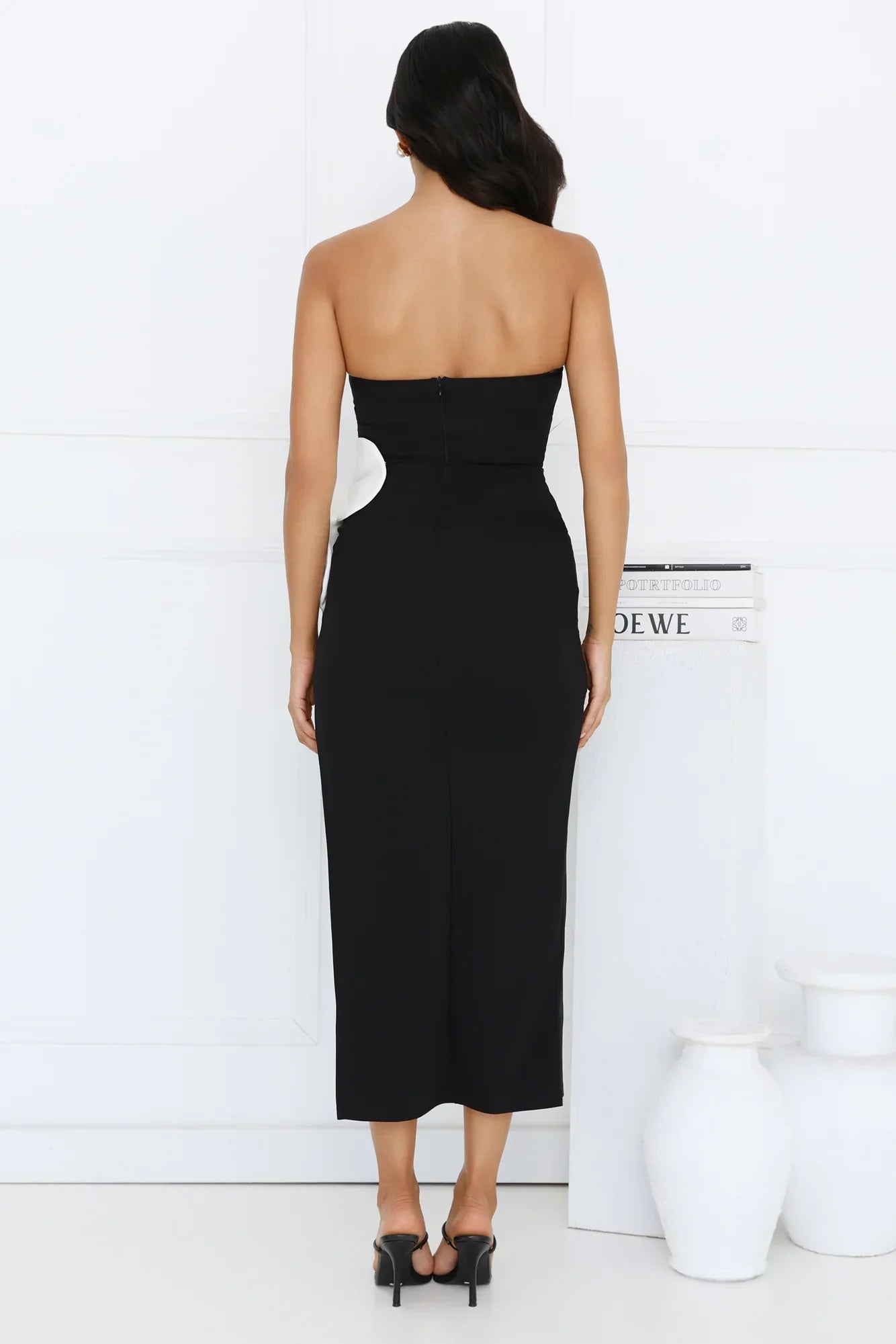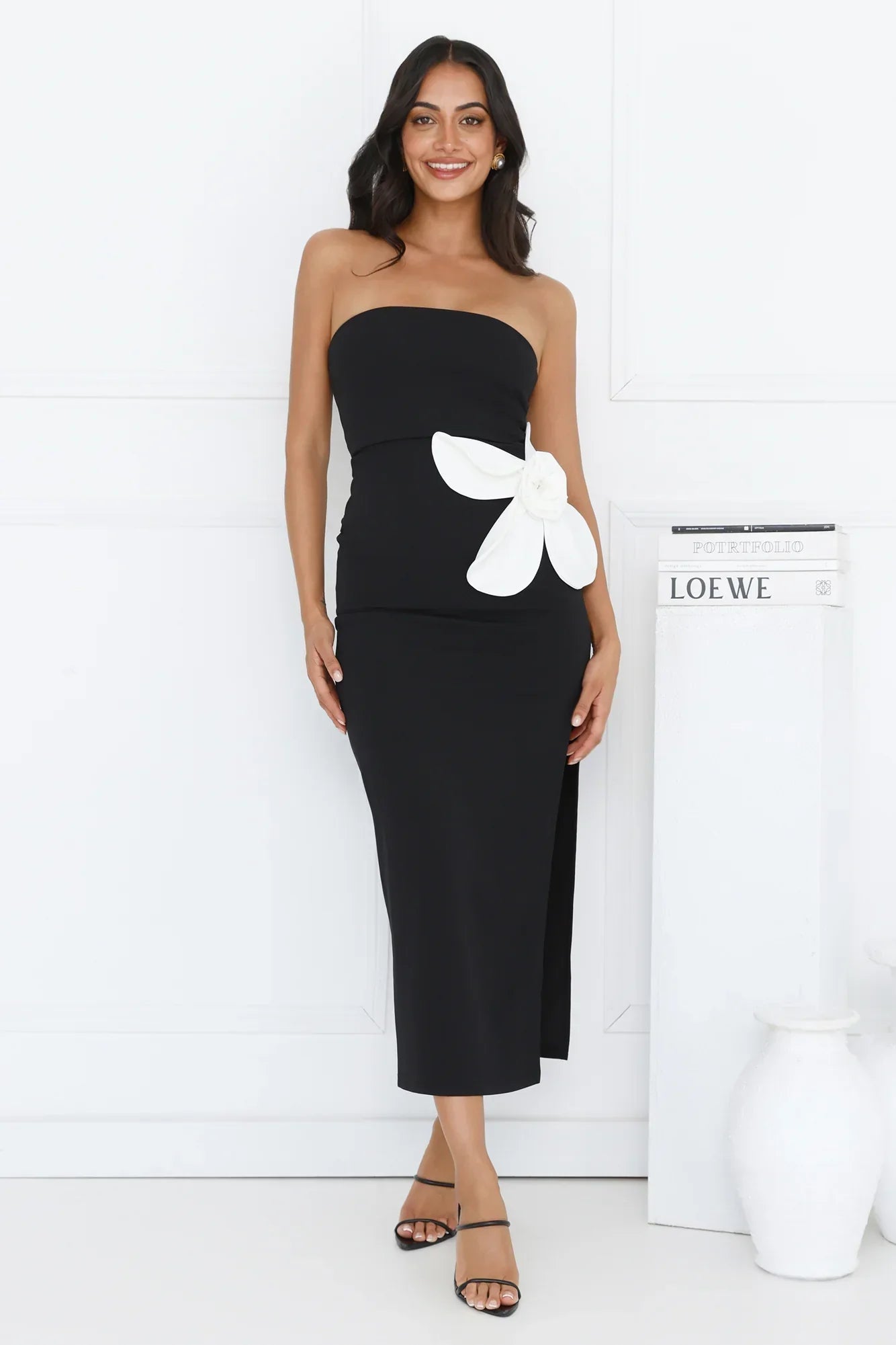 It's heating up, lovely. The Elisandra Strapless Midi Dress is your ticket to compliments. Featuring a strapless design, a flower applique to the side and a side split for comfort. Style with heels and curls!
