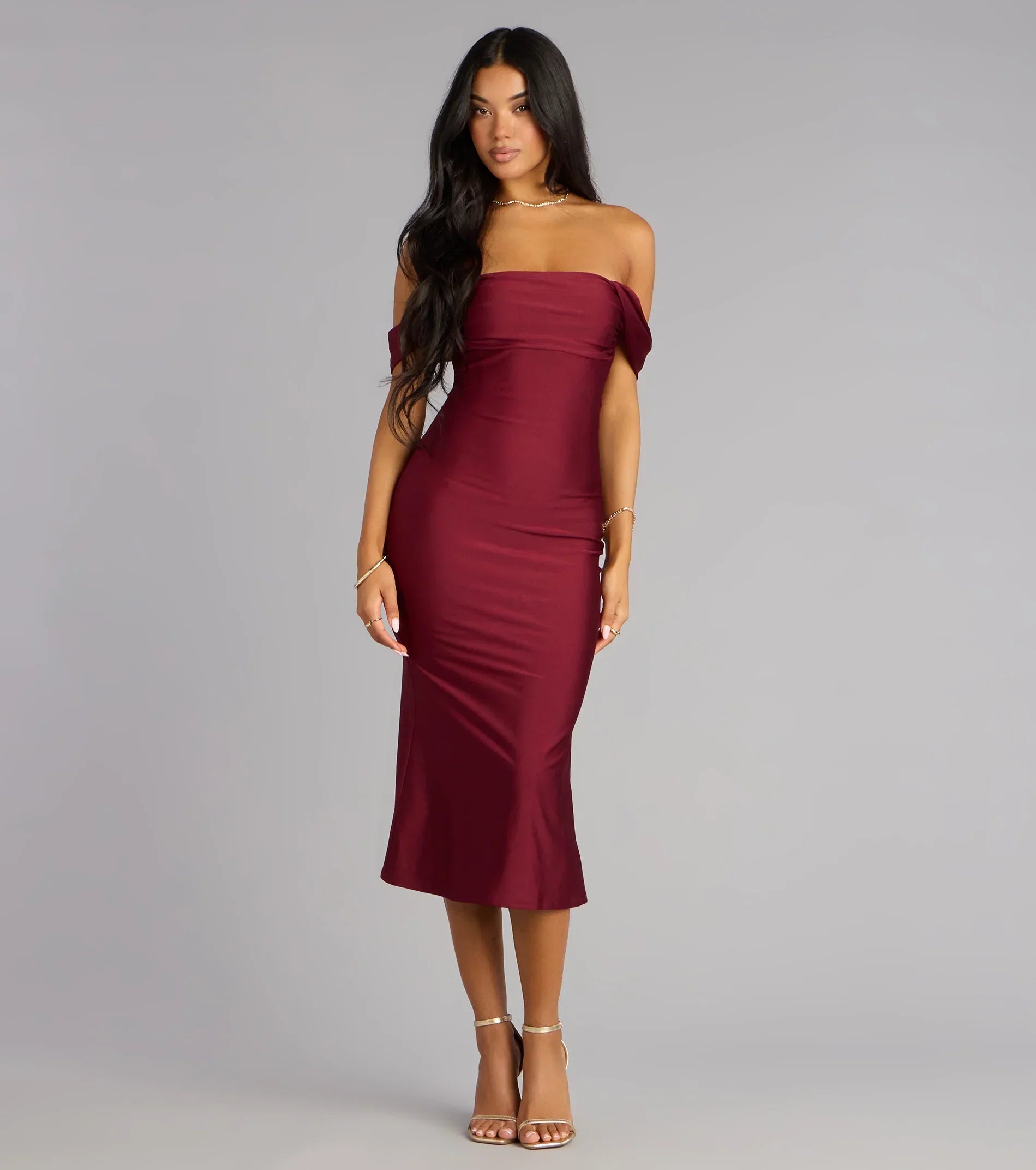 Every occasion is worth celebrating in this off-the-shoulder midi dress! The smooth and stretchy knit fabric includes a full-length knit lining for additional coverage. The off-the-shoulder neckline and short-sleeve cuffs add a touch of elegance, while the bodycon silhouette and flared midi-length hem accentuate your curves in all the right places. Complete the look with teardrop and heels.
