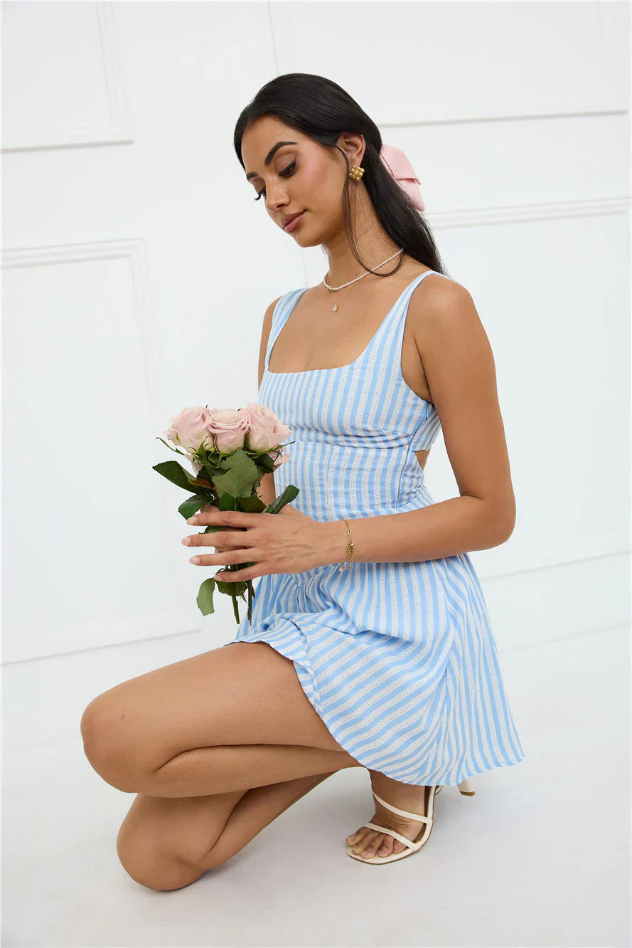 The Gleaming Daylight Mini Dress features a striped print with textured fabric, a flowy skirt, and a chic cutout to the back—ideal for a stylish, sunny day look. Style with sandals and minimal accessories for an effortless, polished outfit!