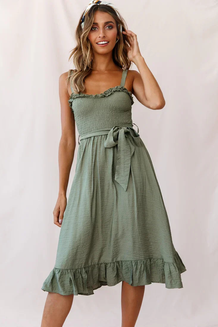 As sweet as honey! We are in love with this breezy dress, perfect for a sunny day picnic with your girls or strolling the markets looking for vintage treasures. Featuring a frill-trimmed shirred bust, A-line skirt and separate waist belt. It would look super cute with a straw tote and leather sandals or dress it up with some mules and layered, gold coin necklaces for an on-trend look.