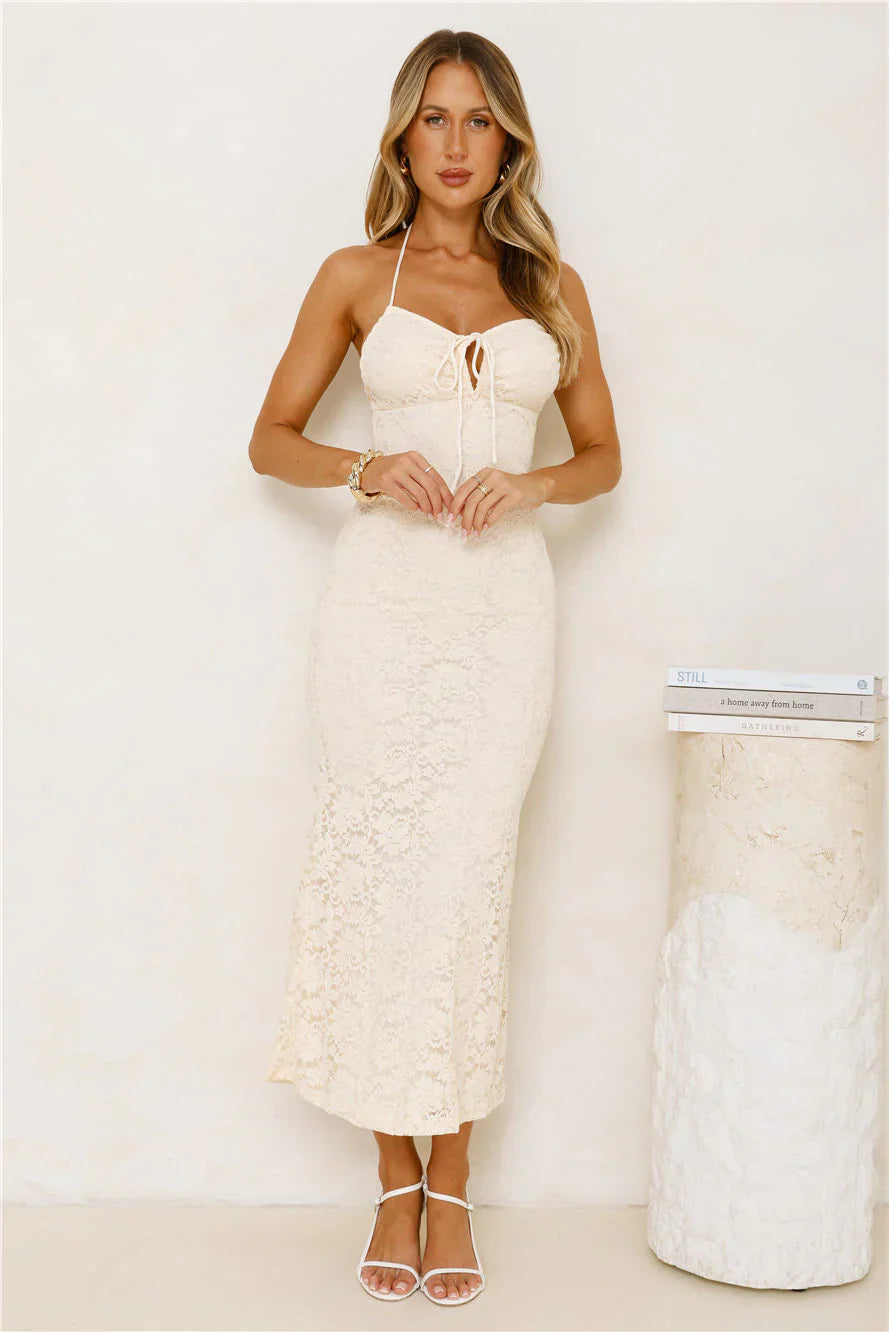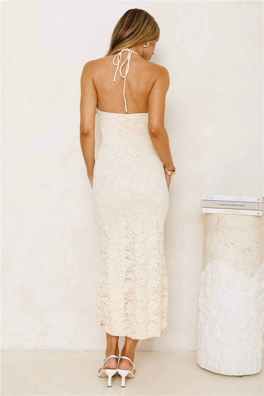 The Iconic In Style Lace Midi Dress features a delicate lace design with a halter tie and V-neckline with a tie. Style with strappy heels and a sleek clutch for an elegant, sophisticated evening look.