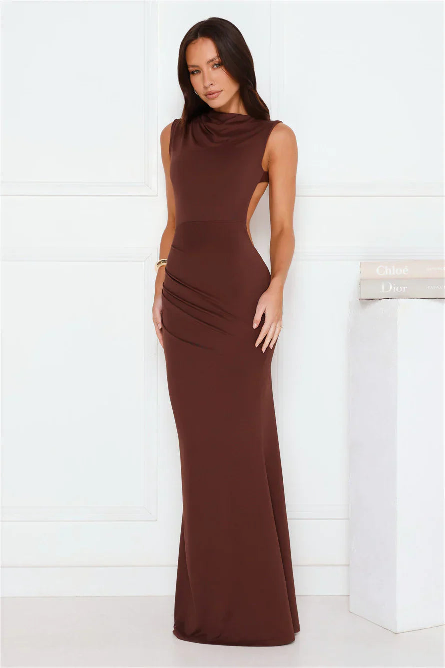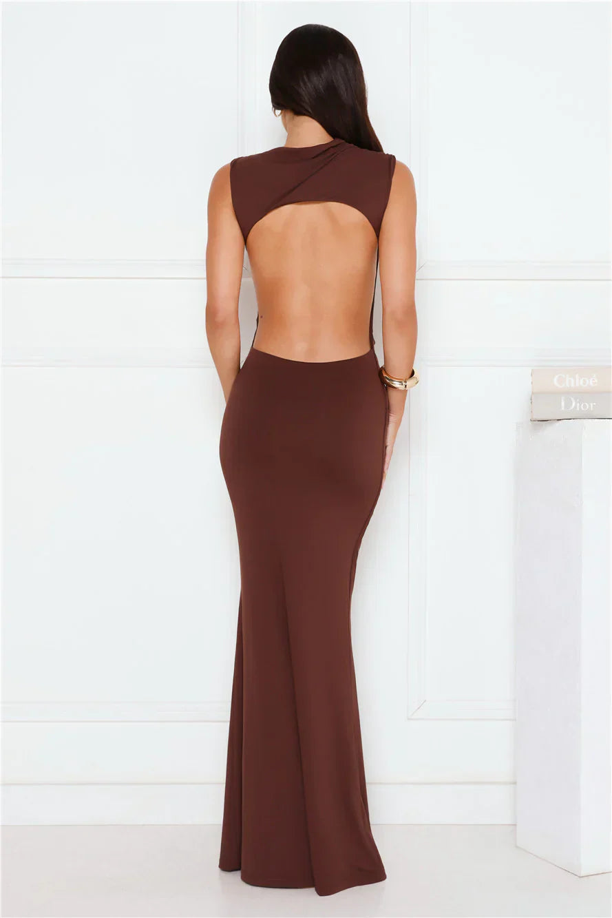 The Investment Piece Maxi Dress features smoothing stretch fabric, a high neck, and a gorgeous open back. This sleek silhouette is perfect for dressing up with strappy heels and statement earrings for a sophisticated event.