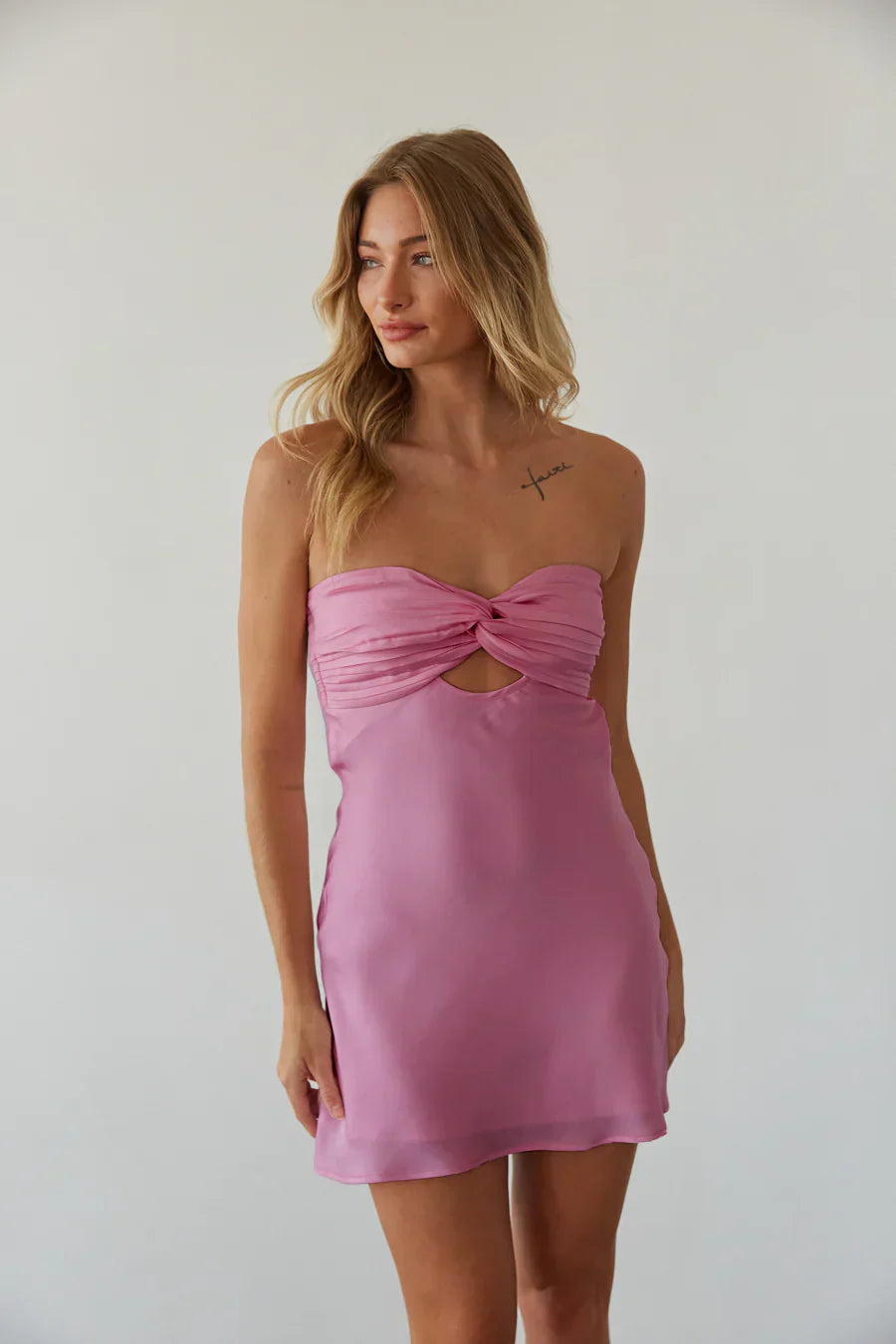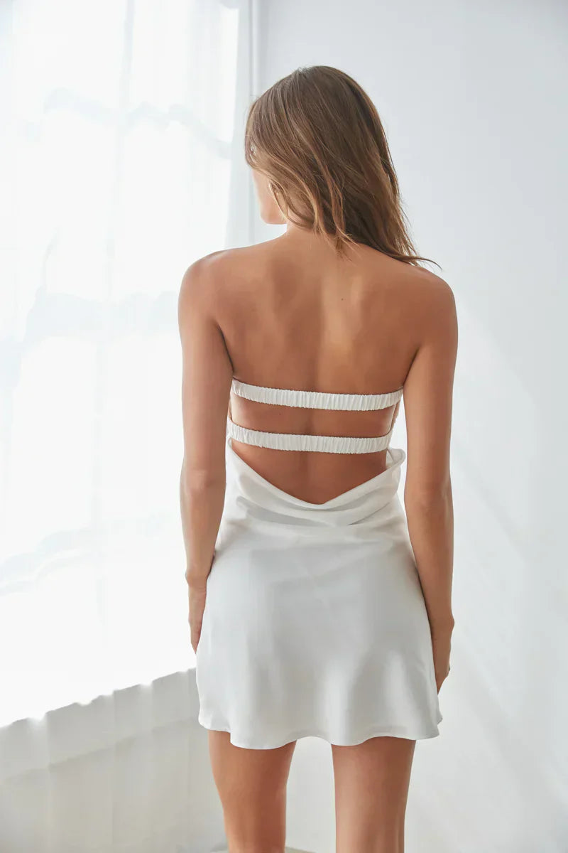Dance the night away in the Kiara Strapless Keyhole Open Back Mini Dress! This stunning satin dress features a strapless sweetheart neckline with a center keyhole cutout, pleated twist front bust, and an open cowl back with two smocked elastic straps. Available in black, baby pink, sugar plum, cherry red, white, midnight blue, red, and cobalt blue. Finish off the look with a chic !