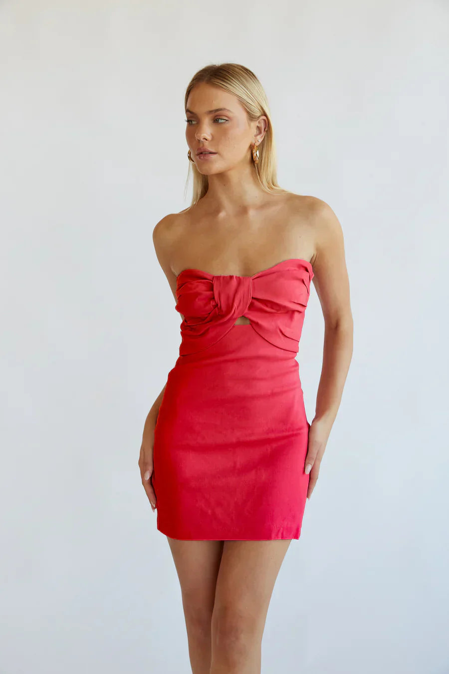 You'll be the life of the party in the Kynlee Strapless Twist Front Bodycon Mini Dress! This adorable mini dress features a strapless neckline, bodycon silhouette, and a ruched twisted keyhole front design. Available in white, bubblegum pink, black, red, watermelon, and rose. Pair with your favorite to finish off the look!