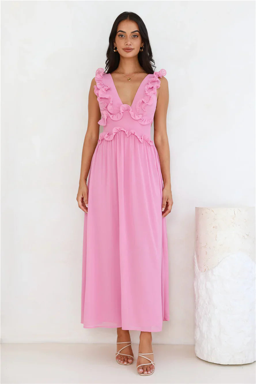 The Light Embrace Maxi Dress features delicate frill details and an open crisscross back for a flirty yet elegant look. Its flowing design adds a touch of softness, making it the perfect choice for a bright, sunny day or evening event. Style with heels.