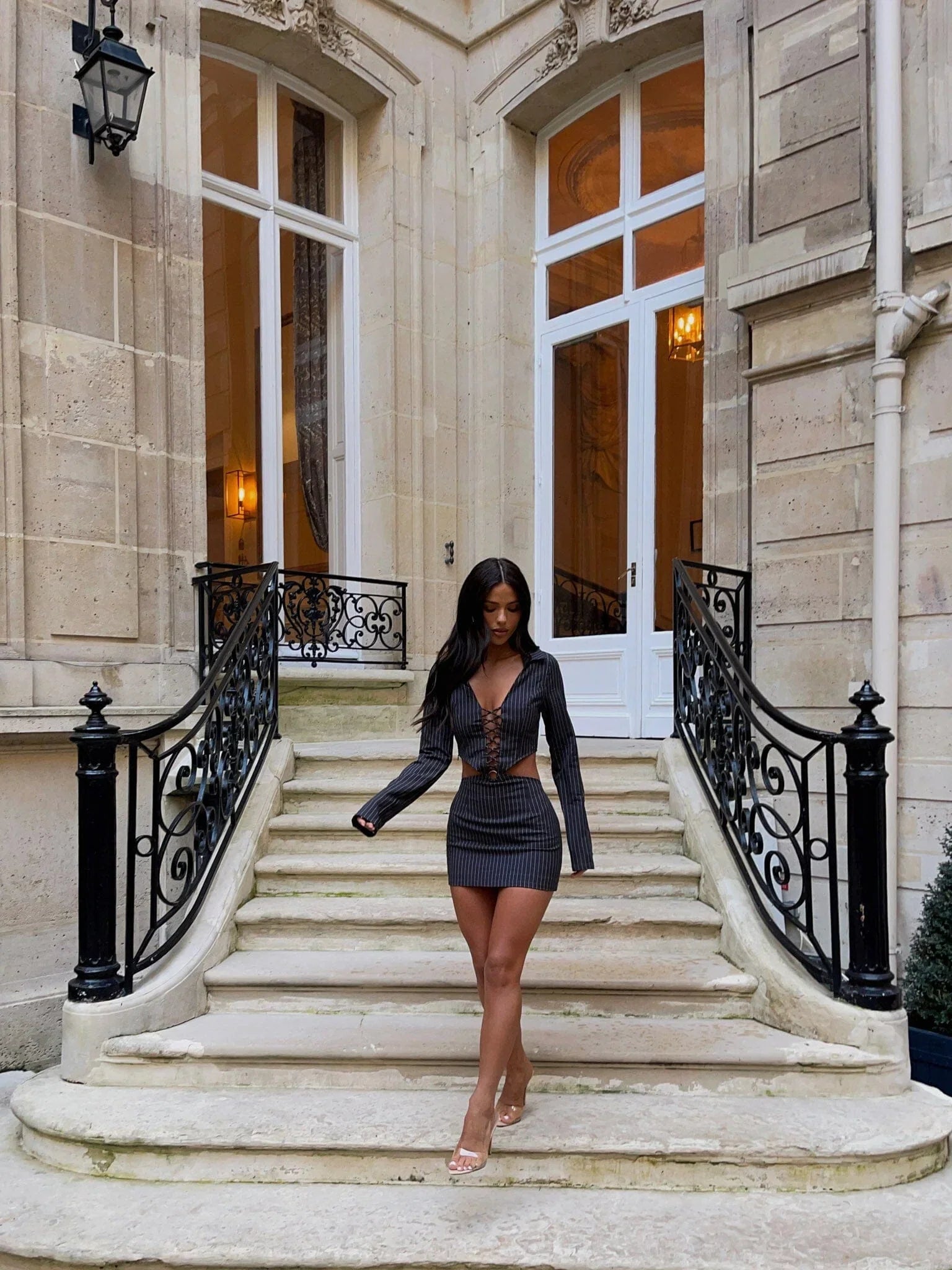 Make an unforgettable entrance in the effortlessly chic 'Liza Mini Dress' in Grey Pinstripe!