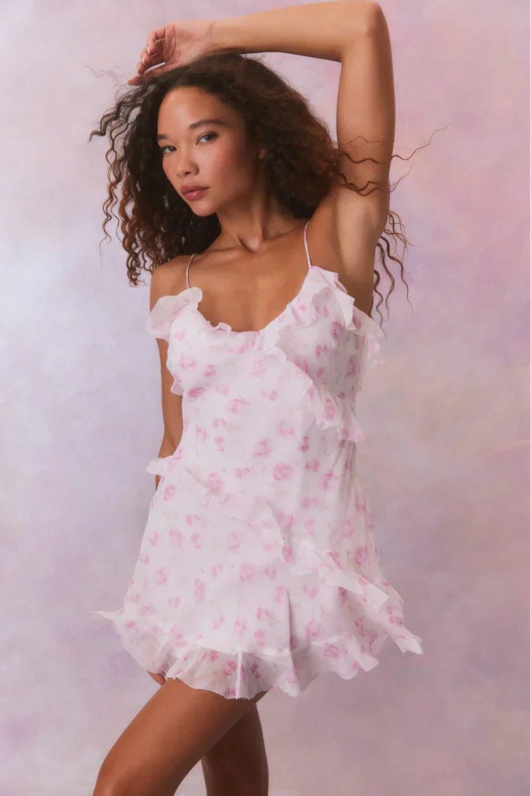 Introducing the Lomina Dress. The mini version of our best-selling Rialto, this flirty dress debuts in our signature fragrance prints. With a chiffon fabric, this dress features thin spaghetti straps and overlapping, asymmetrical ruffles at the neckline that descend through the slightly fitted skirt. Match your favorite scent to your look with this must-have mini.
