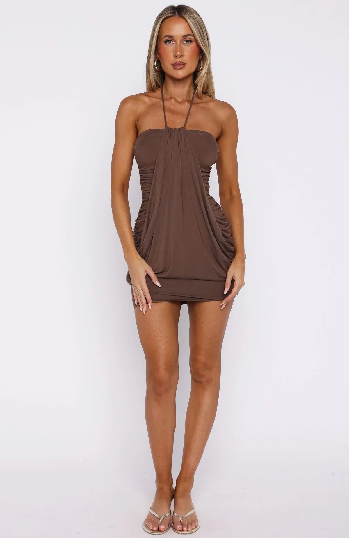 The Looking For Answers Halter Mini Dress in Mocha is designed for bold nights out. Its halter neckline and draped fabric from bust to hem create a flattering blend of a fitted and flowing silhouette. The mini length and side ruching enhance its playful edge, making it perfect for evening events. Pair it with kitten heels and chunky gold jewellery to complete the look and make a statement wherever you go.