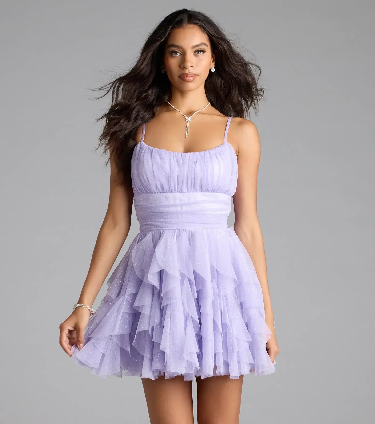 Bring the sparkle to any party or event in the Louisa glitter skater dress with mesmerizing ruffles and the perfect short-length hem for twirling on the dance floor!