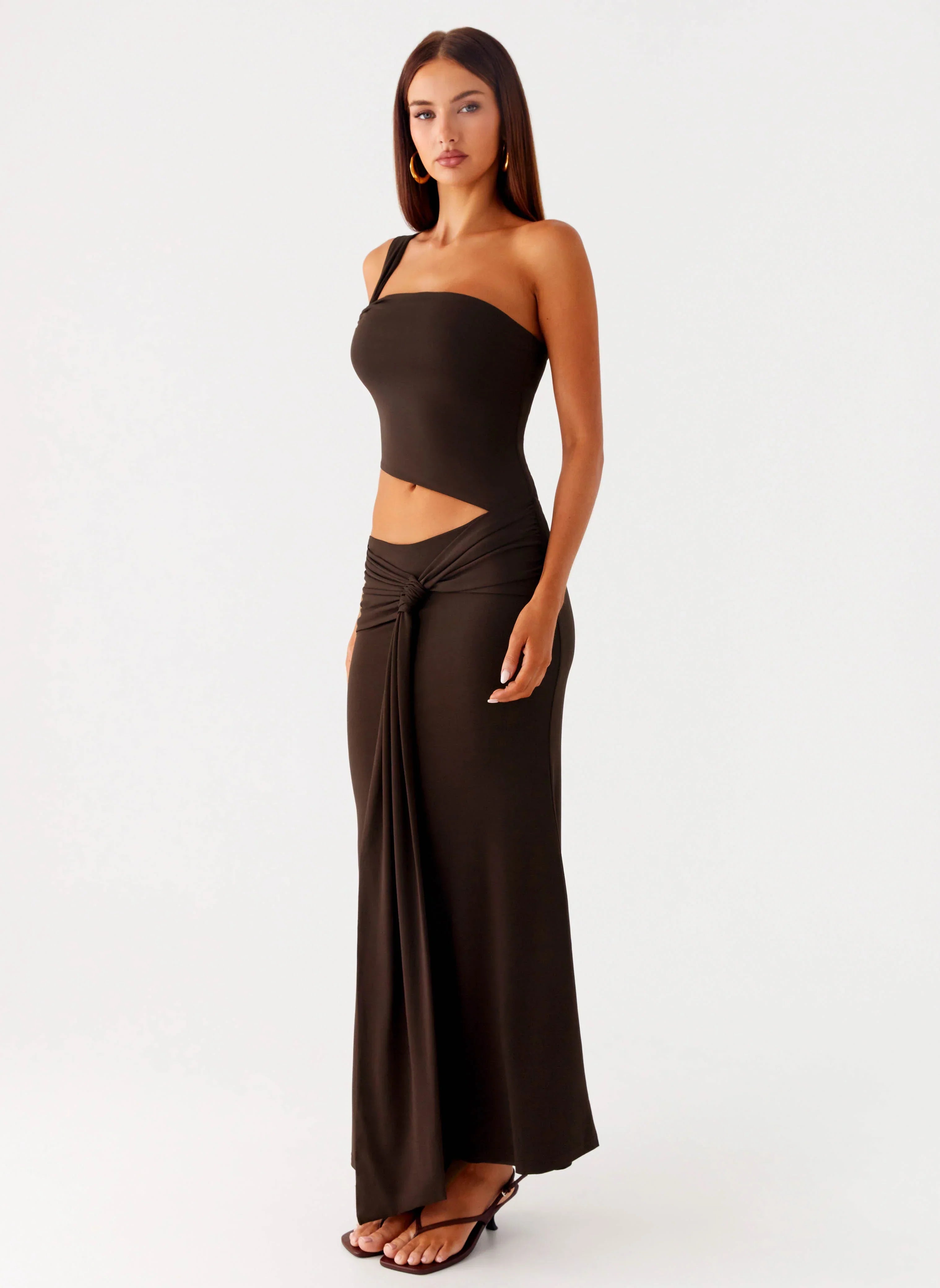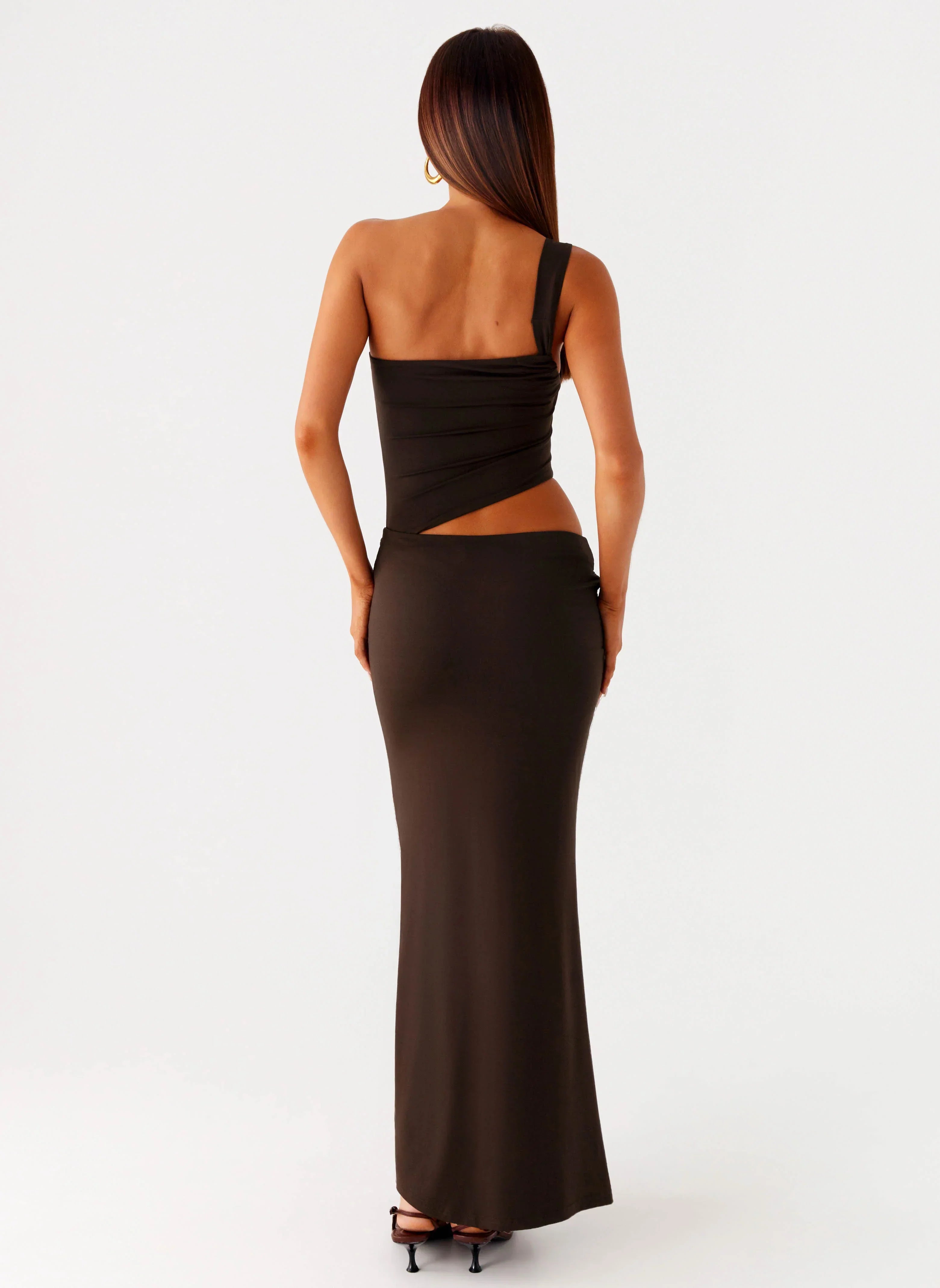 The Luara Cut Out Maxi Dress is made for moments that flow effortlessly from golden hour into the night. Featuring a one-shoulder strap with front sash tie and side cut-outs, this stretch jersey maxi sculpts your silhouette with ruching and a sleek silicone neckline tape for flawless fit. It’s the ultimate blend of bold details and feminine elegance.