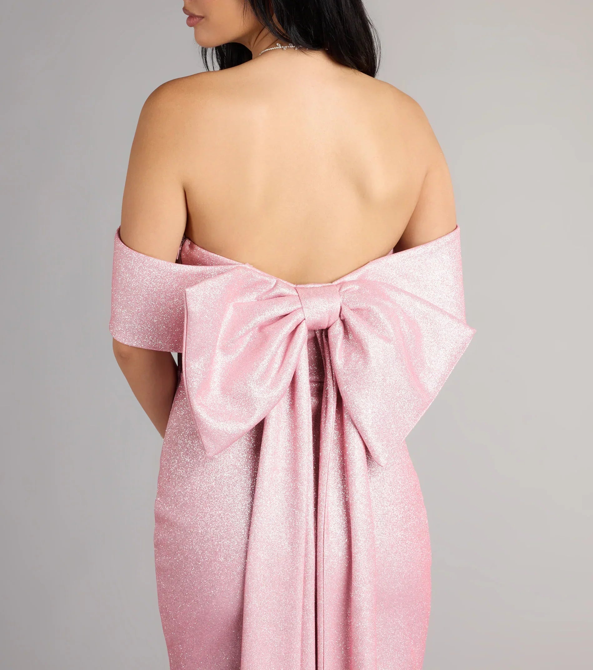 Made to turn every entrance into a moment, the Lucinda glitter bodycon mini captivates with its off-the-shoulder neckline and dramatic back bow with a sweeping train. A striking balance of polish and play, it’s the definition of unforgettable.
