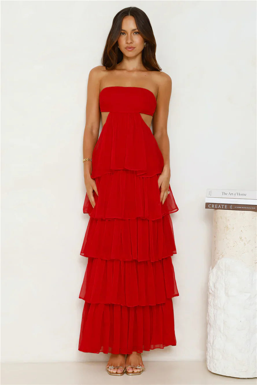 Set the style standards in the Luxe Mode Strapless Maxi Dress. It features an elastic back, a cutout to the waist and a tiered frill skirt. Style with heels and curls.