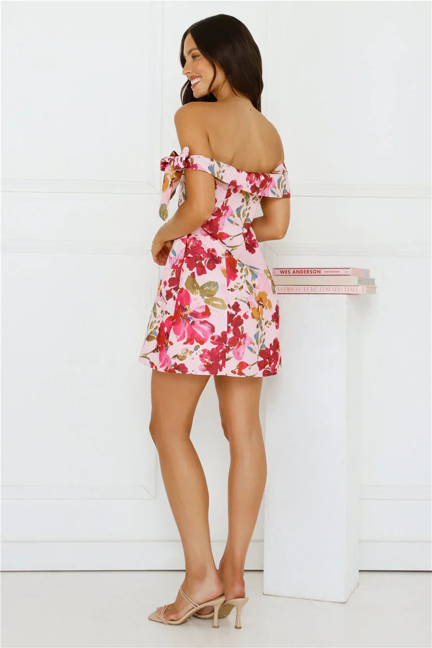 The Luxe Seraphina Off Shoulder Mini Dress is designed with an off-the-shoulder that ties up to one side. Perfect for a night out or a fun event styled with heels.