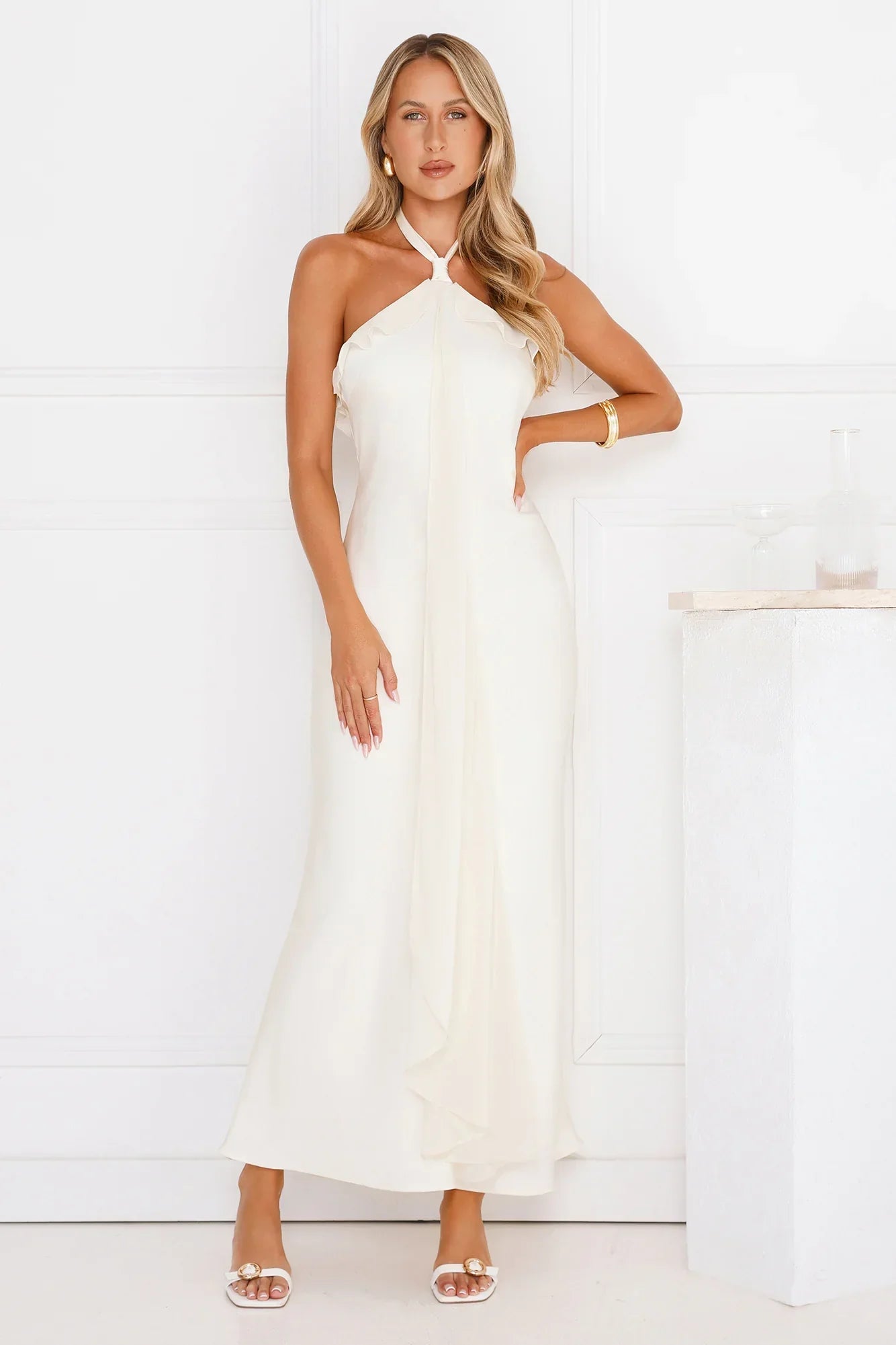 Shine bright in the Luxora Lady Halter Satin Maxi Dress. Featuring smooth satin, a sophisticated halterneck with button closure, and delicate chiffon-style frills, this dress is the perfect mix of grace and glam. Effortlessly chic and made for unforgettable nights. Style with heels.