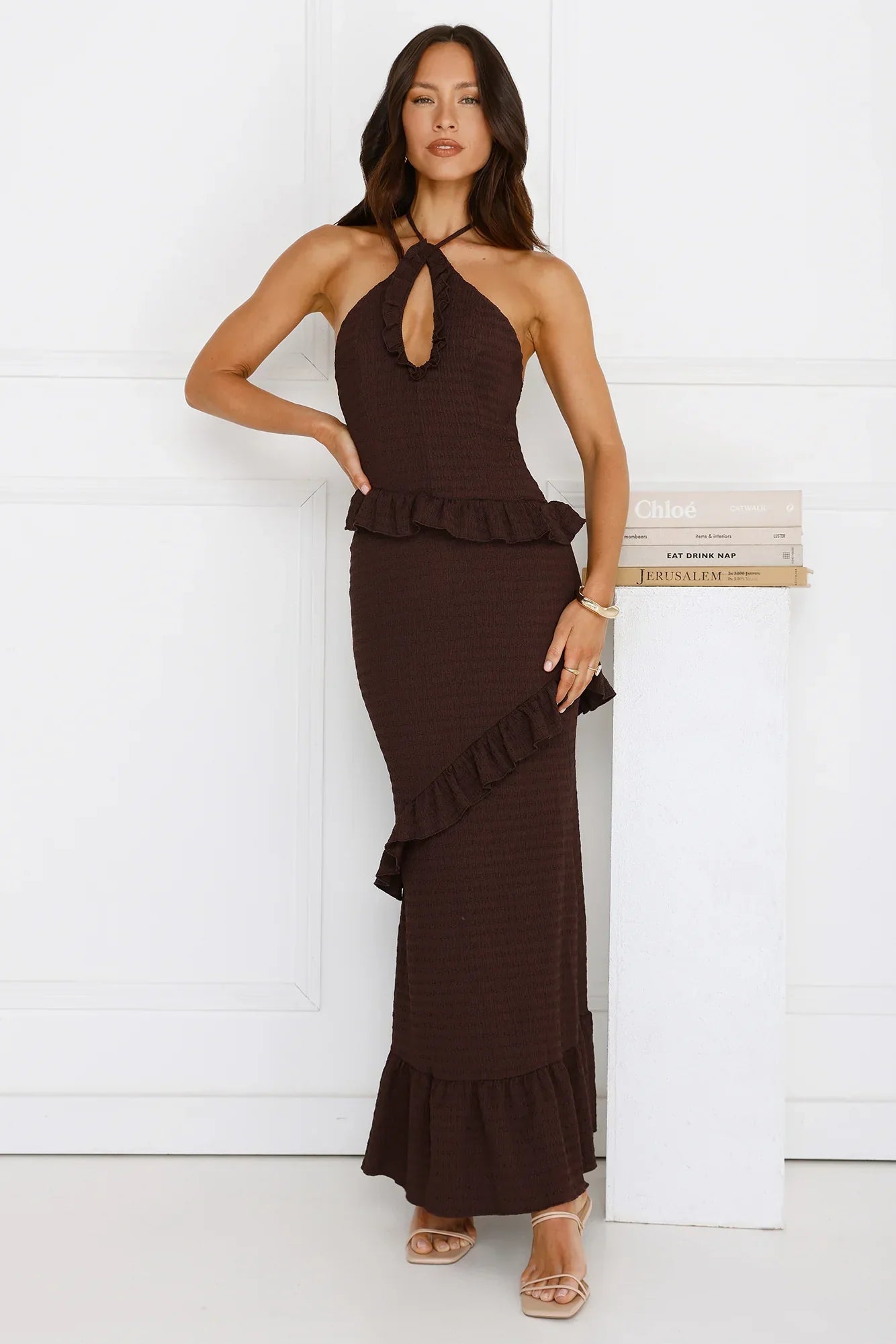 Sun-kissed and stunning—the Mango Mojito Halter Maxi Dress is your new summer essential. Designed from textured stretch fabric, it features a chic halterneck tie and delicate frill detailing for a touch of romance. Style with sandals and gold accessories for the perfect warm-weather look.