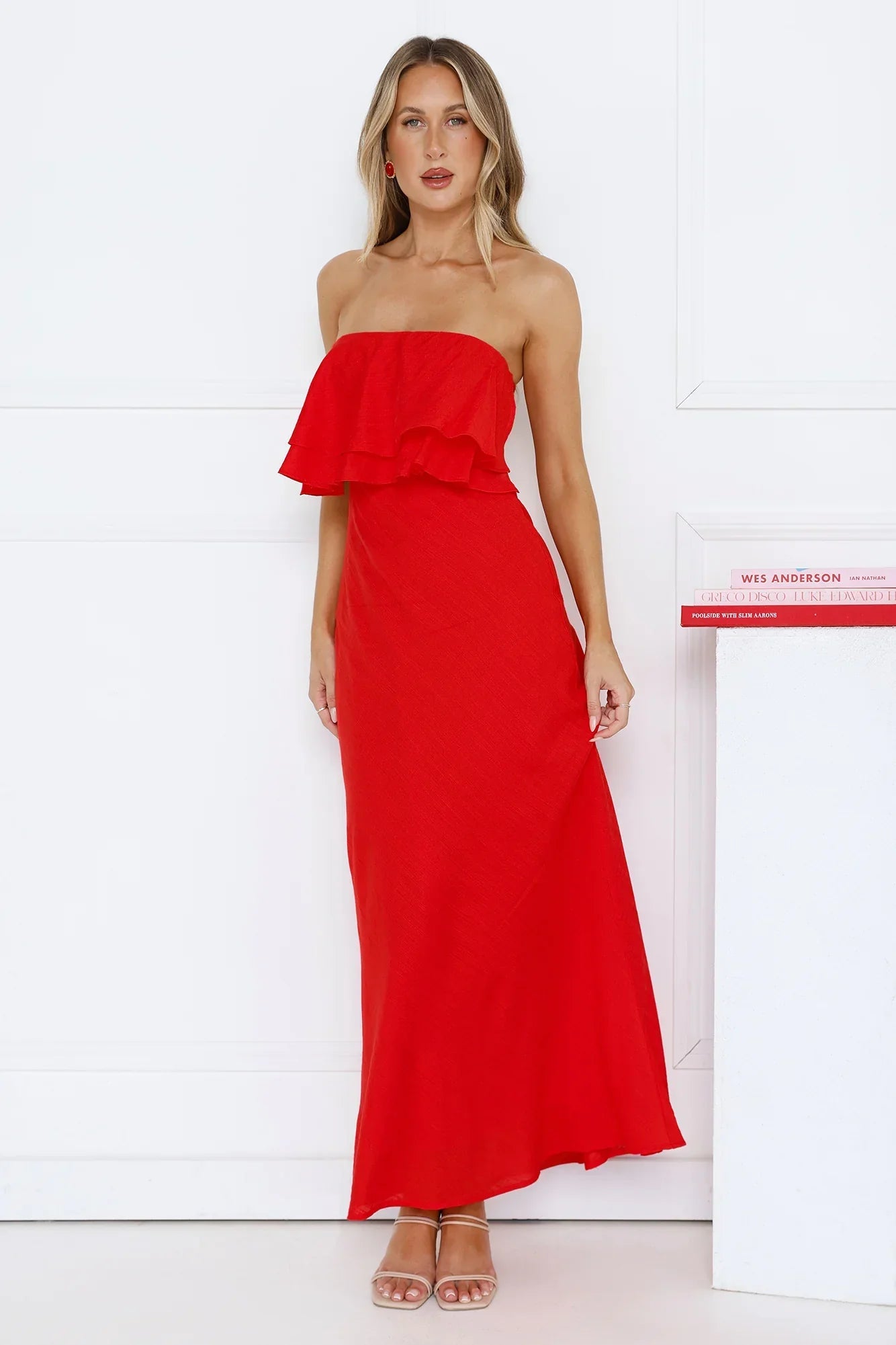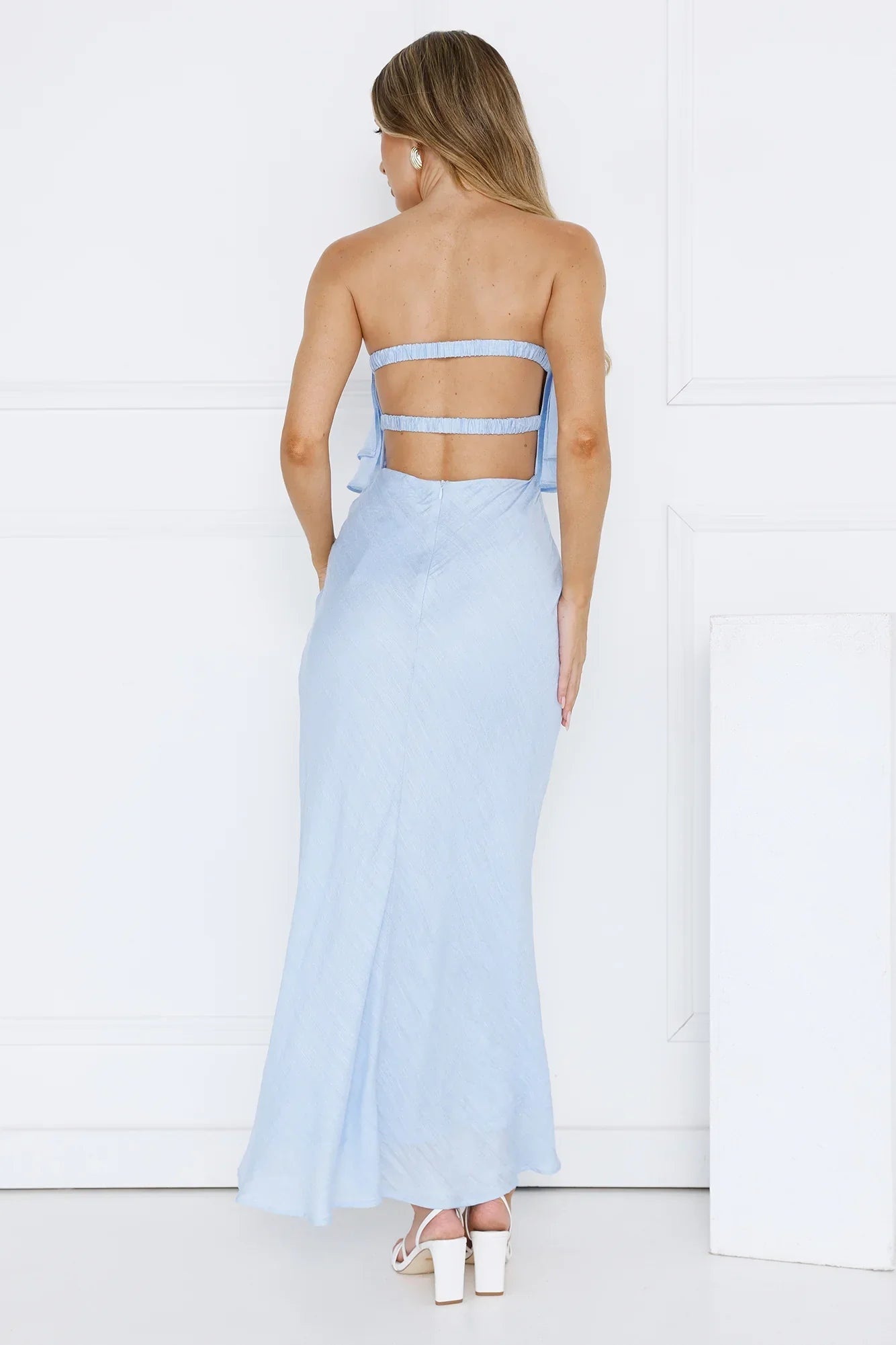 For days that deserve a little extra dazzle, be seen in the Midnight In Paris Strapless Maxi Dress. Featuring an elastic back, a frill neckline and a straight, flowy skirt. Style with heels and curls.