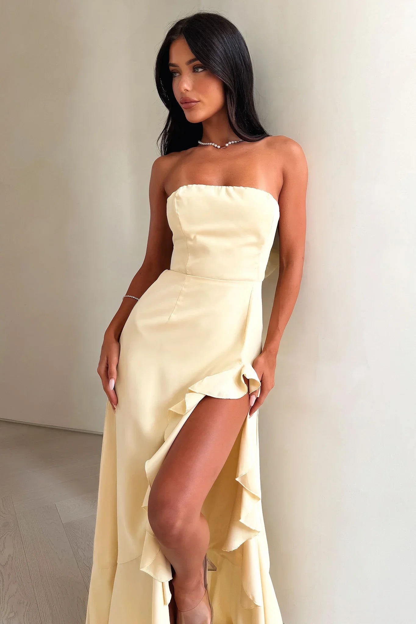 Get ready to turn heads in our Milford Maxi Dress! Featuring a strapless design and frill detailing, this dress also has boning on the sides to keep the bust in place. The ribbon tie back adds a cute touch, while the invisible back zip and hook and eye closure provide convenience. With a lined interior and silicone tape on the inside of the neckline, this dress is both stylish and comfortable. Complete the look with heels and gold jewellery for a stunning ensemble!