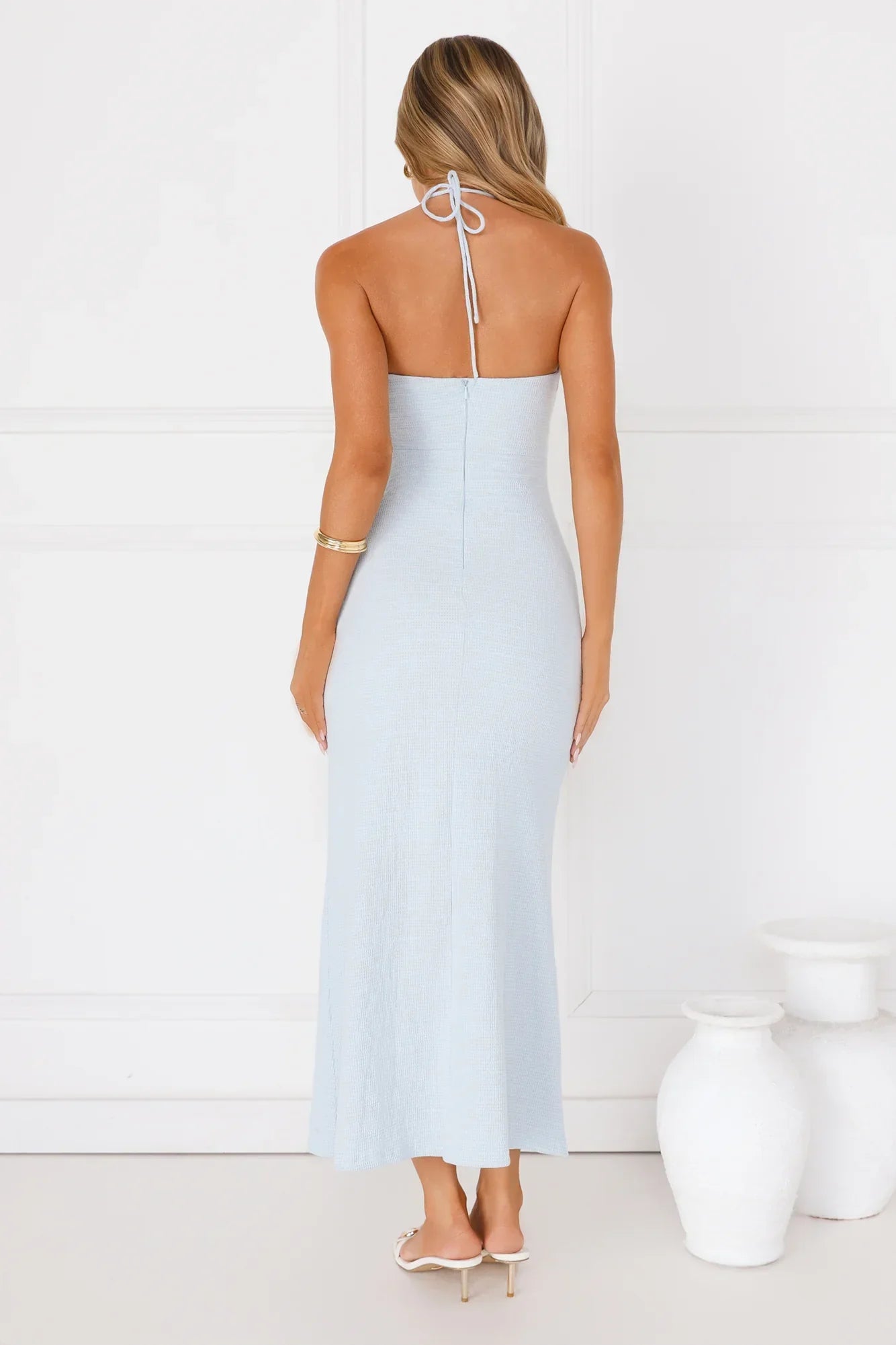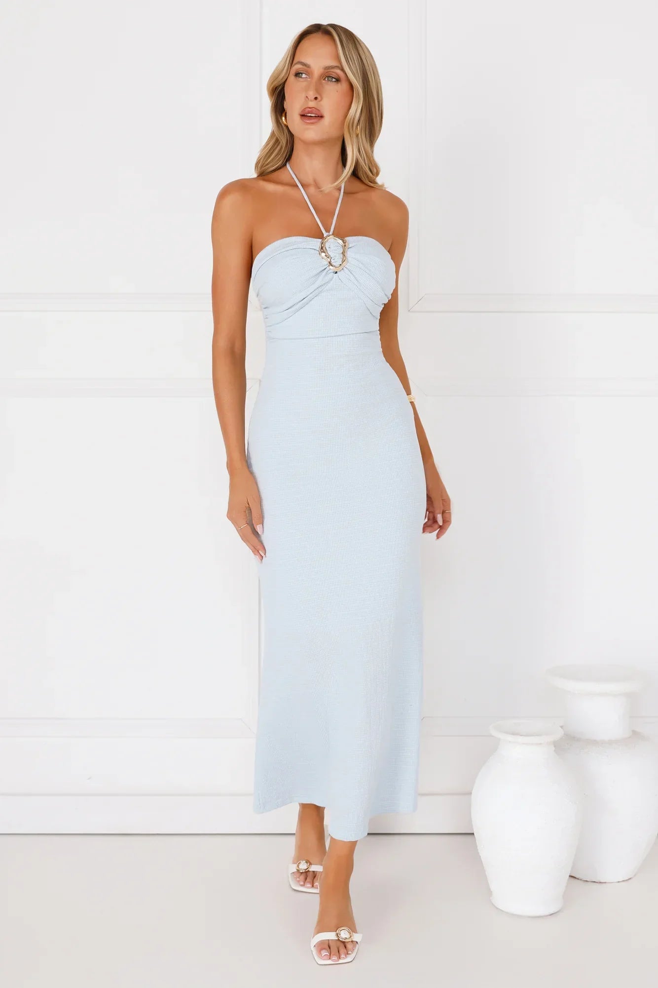 Elevate your look with the Minimalist Luxe Halter Midi Dress. Stretchy textured fabric hugs in all the right places, while the chic halter tie and delicate detail at the neckline add just the perfect touch of sparkle. Sleek, effortless, and made for your next unforgettable moment. Style with heels.