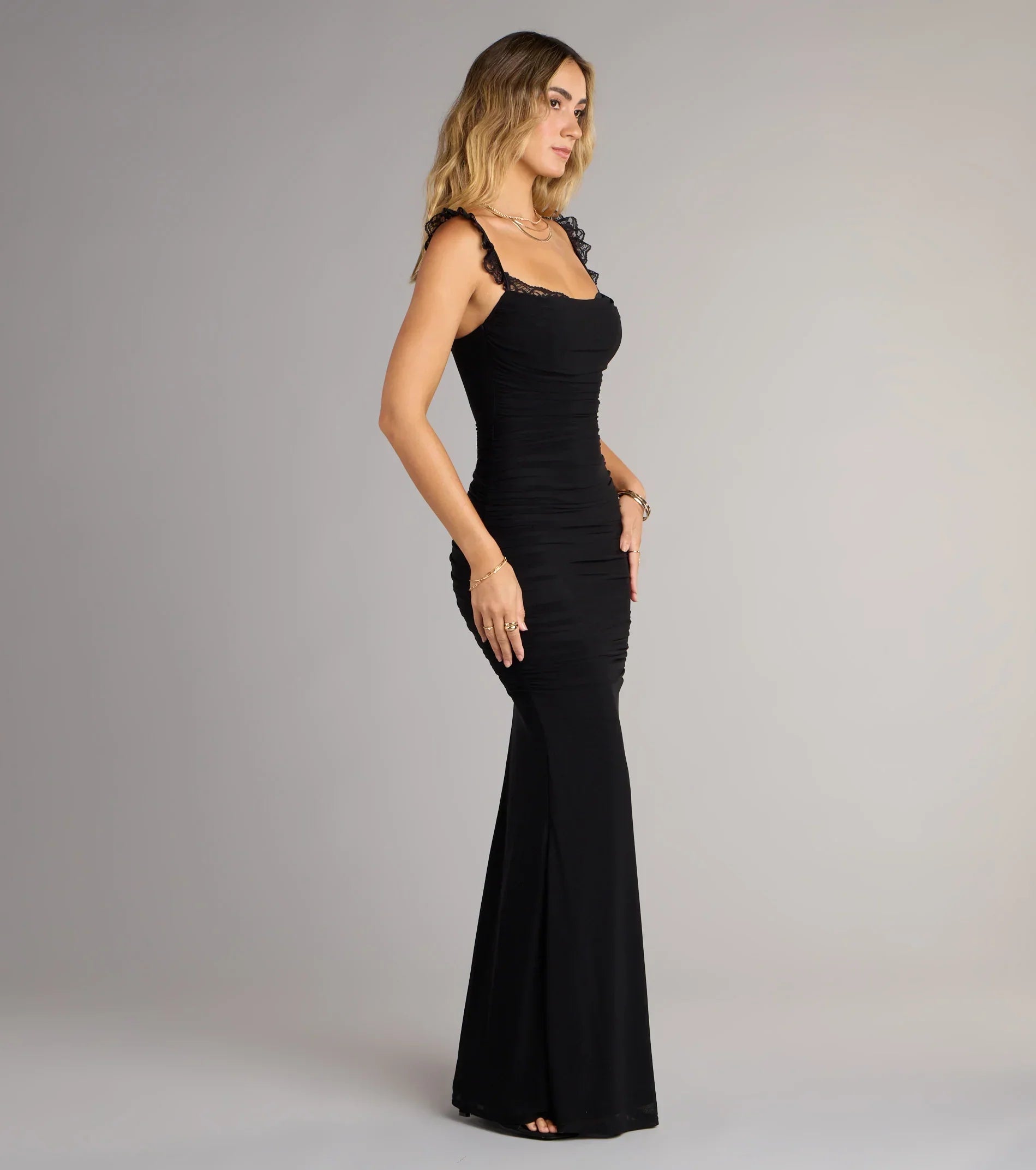 The long formal dress features a sleeveless sweetheart neckline with floral lace trim, lace flutter shoulder straps, a lace-up back design, ruching throughout to enhance curves, and a mermaid silhouette that flares at the hem.