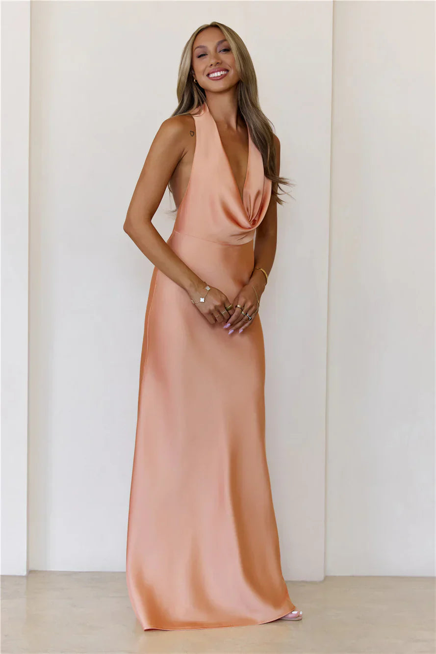 Step into elegance with the Nightfall Noir Halter Satin Maxi Dress, designed with a luxe satin finish, a chic cowl neckline, a halter tie for the perfect fit, and a sultry open back for an effortlessly glam look. Style with heels.