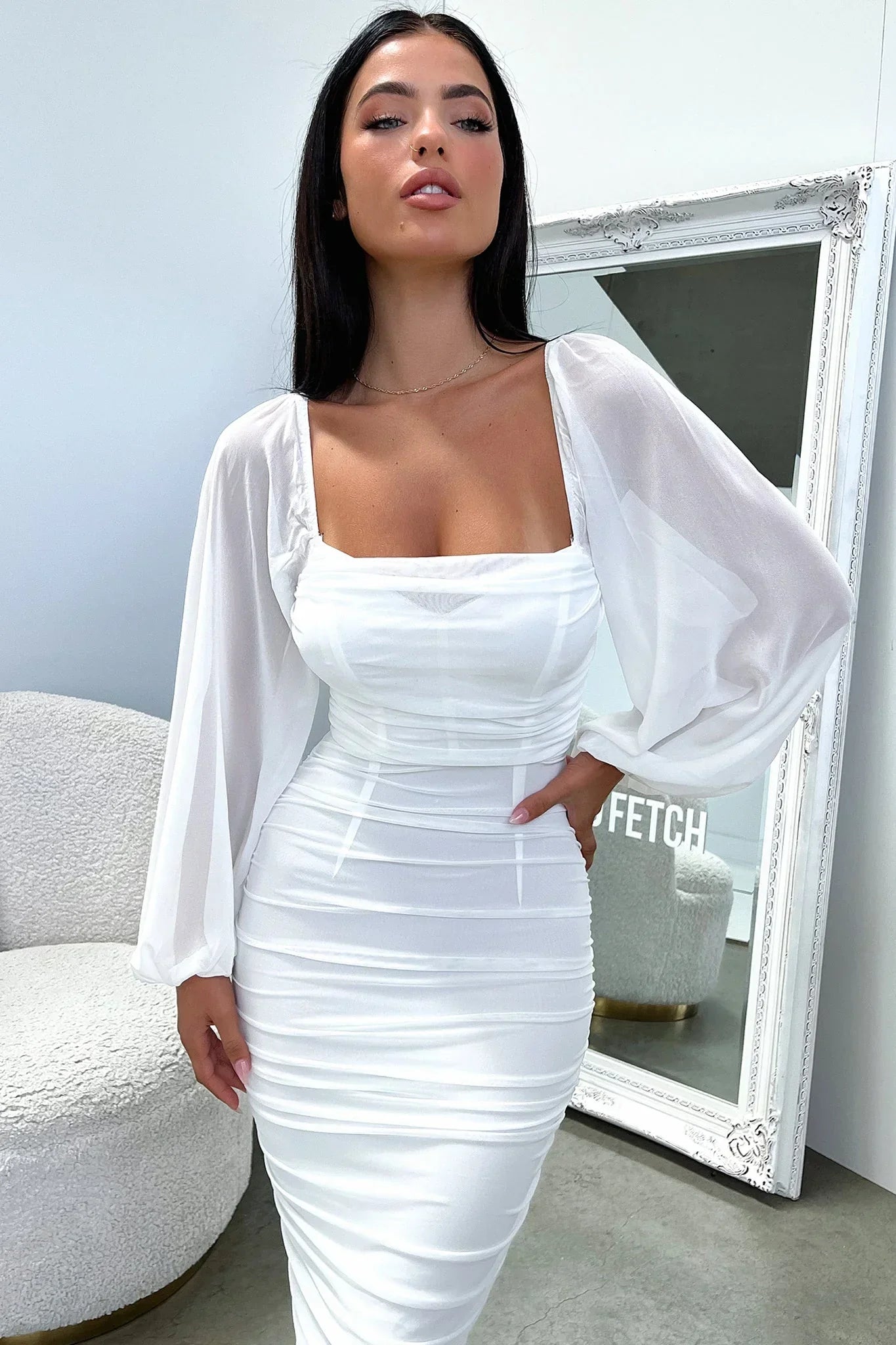 Your fave stand out dress now comes as a maxi! This babe features an all over ruched fabrication, an off the shoulder style, sheer long sleeves and is completed with an invisible back zipper. Pair her with your fave heels and gold jewellery for a look they wont forget!
