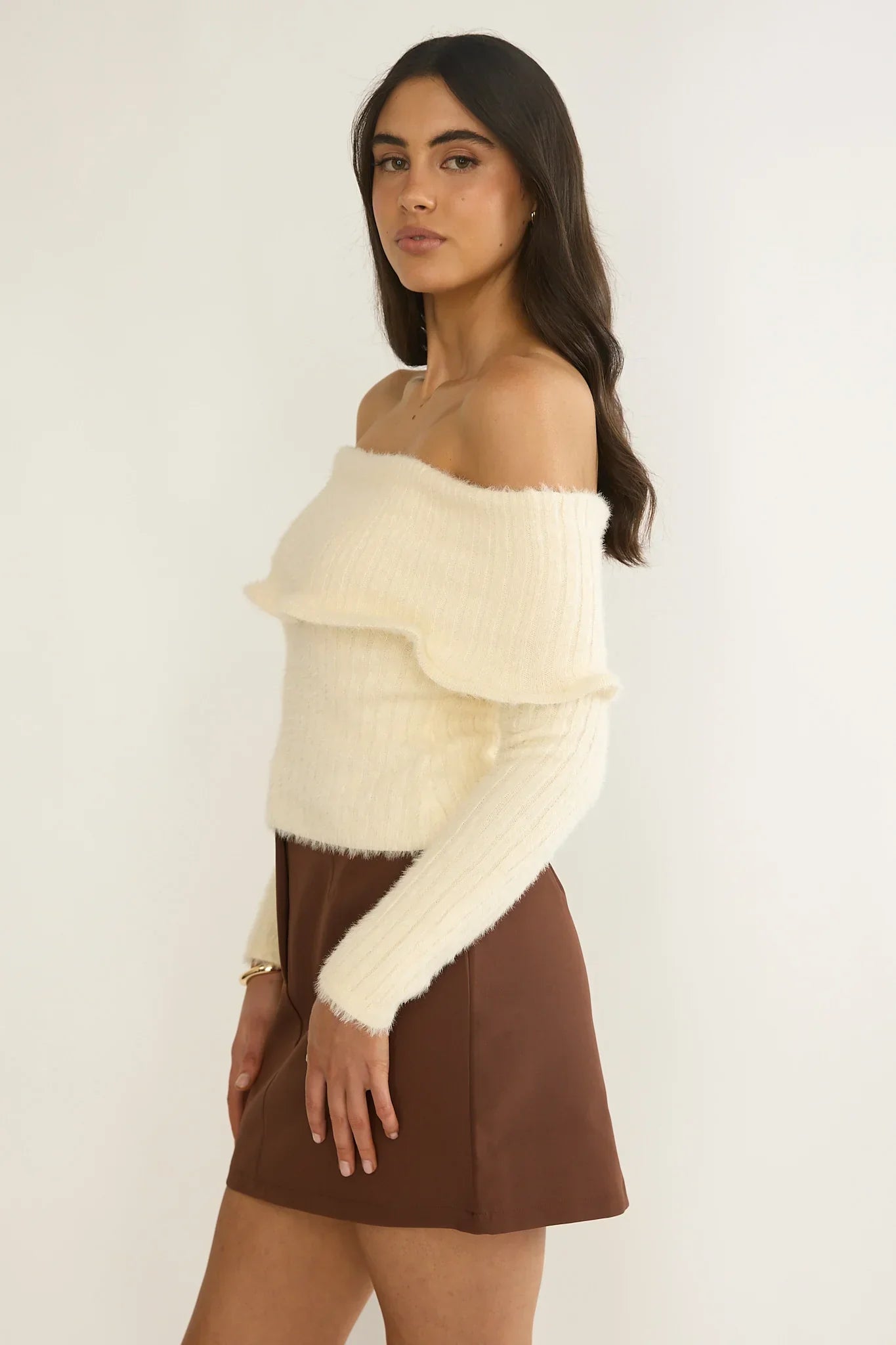 Hello, gorgeous! You will turn heads in our pretty Orielle top. It features a fuzzy knit and off-shoulder design and is perfect for coffee dates with your girls. Team it with a mini skirt and boots for a cute look.