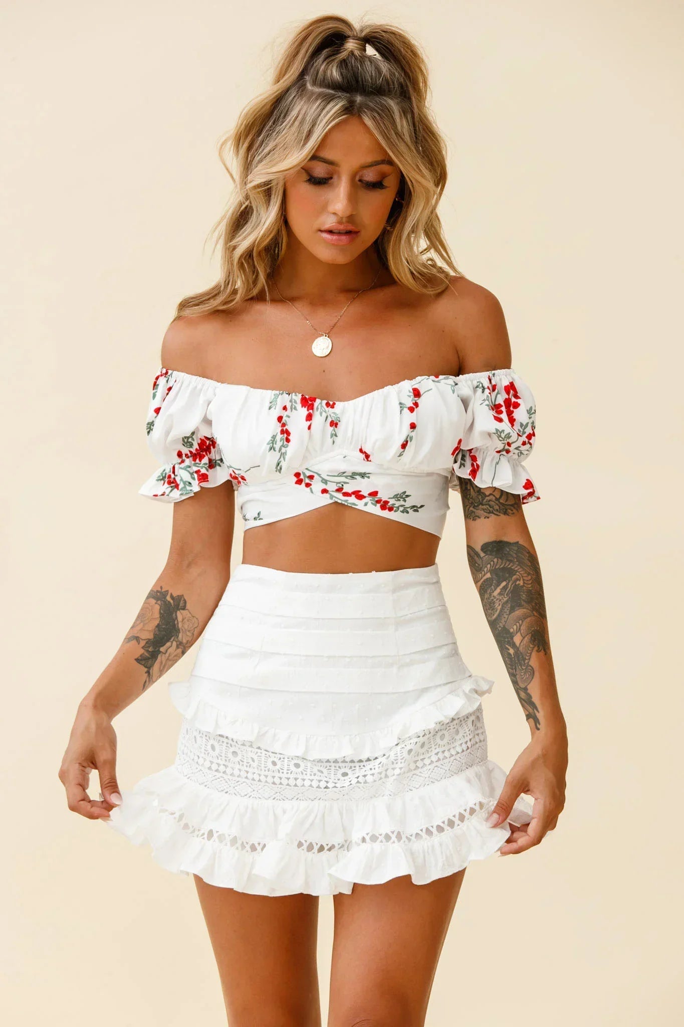 Own the day in our prettiest Perfect Timing skirt. We are loving its feminine silhouette and girly frill and crochet trim details. Perfect for Sunday brunching with your besties teamed with our Linka top and mules for a chic look.