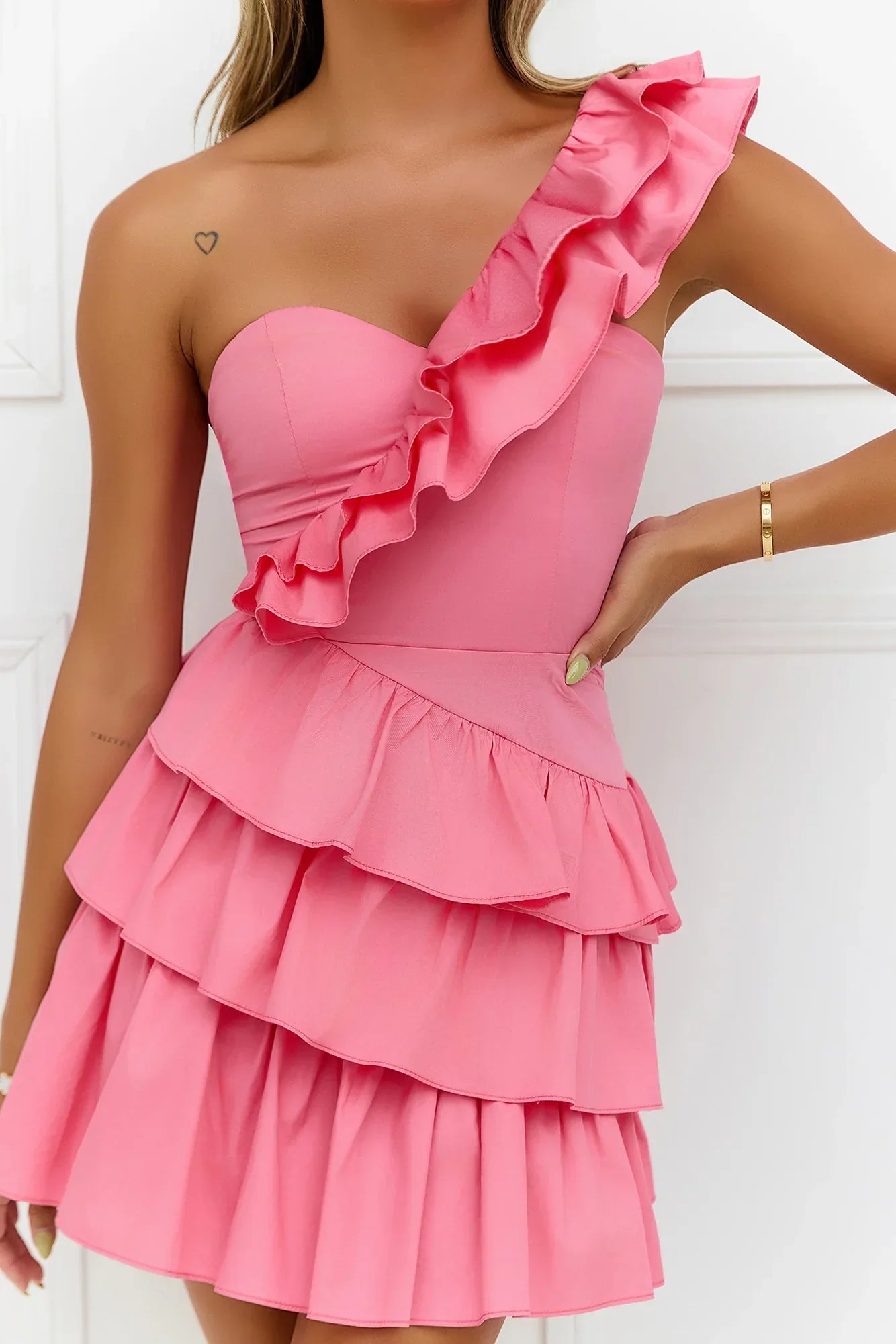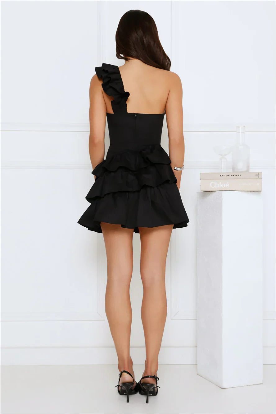 Turn up the heat in the Precious Time One Shoulder Mini Dress. Featuring a gorgeous frill shoulder strap and a tiered frill skirt. Style with sandals for a romantic lunch date.